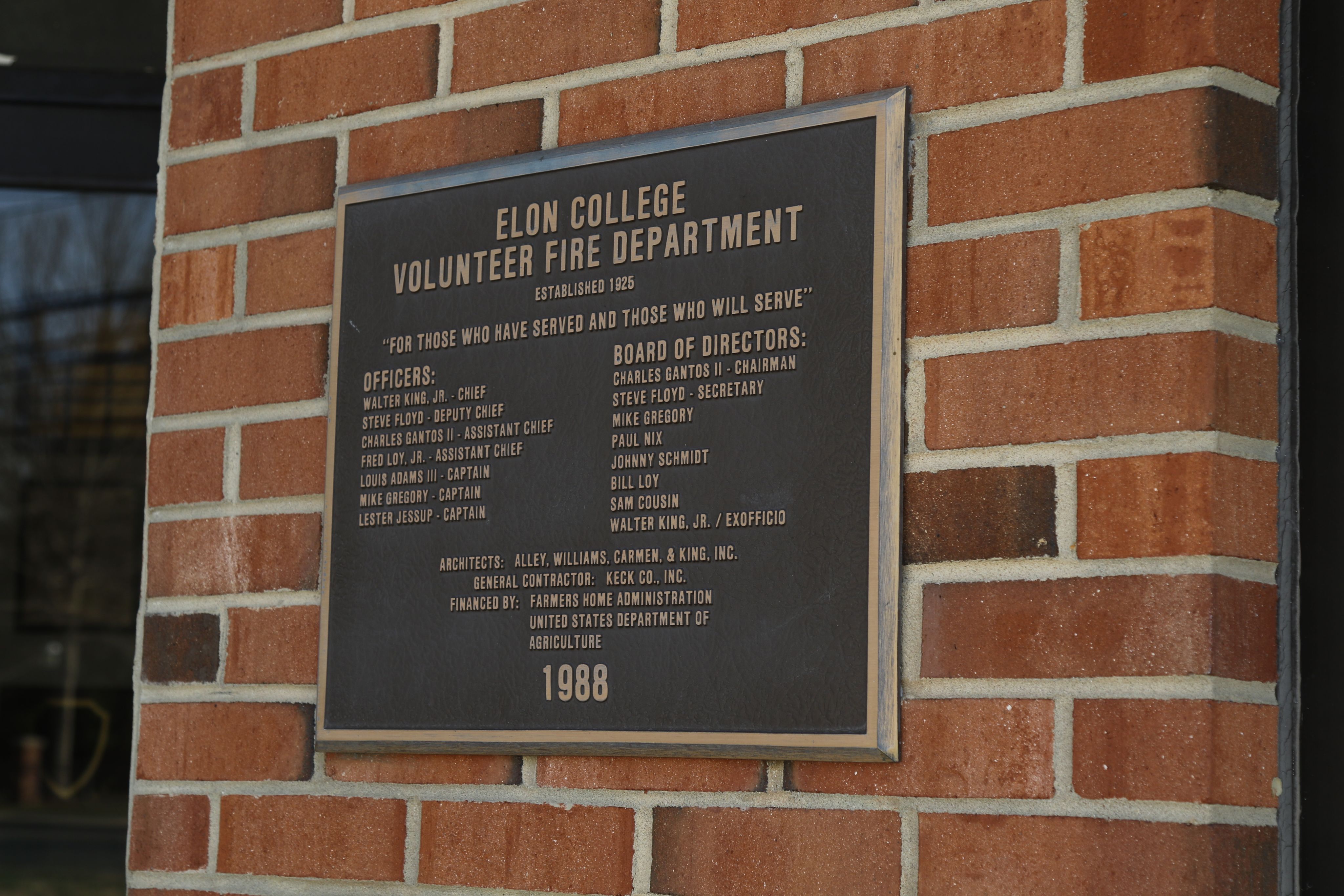 Plaque outside of the Town of Elon Fire Department, listing Elon College (University) volunteers in 1988.