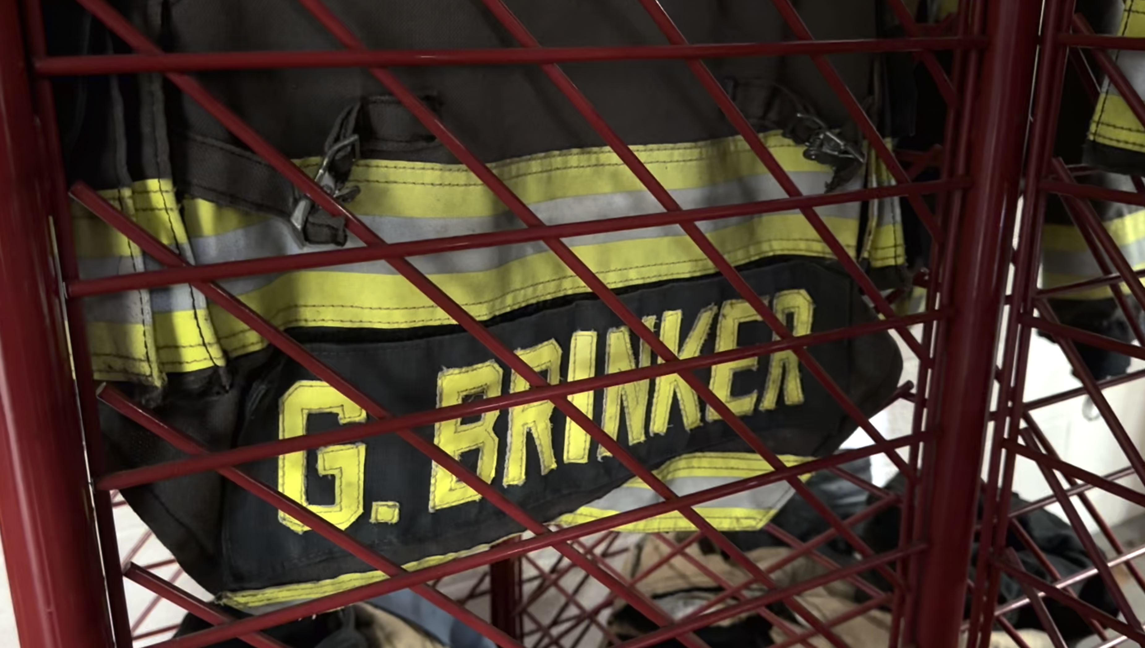 Gage Brinker's firefighting jacket hung up at the Elon Fire Department.