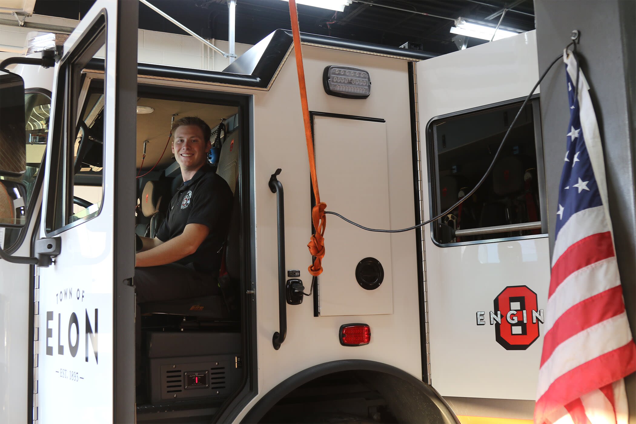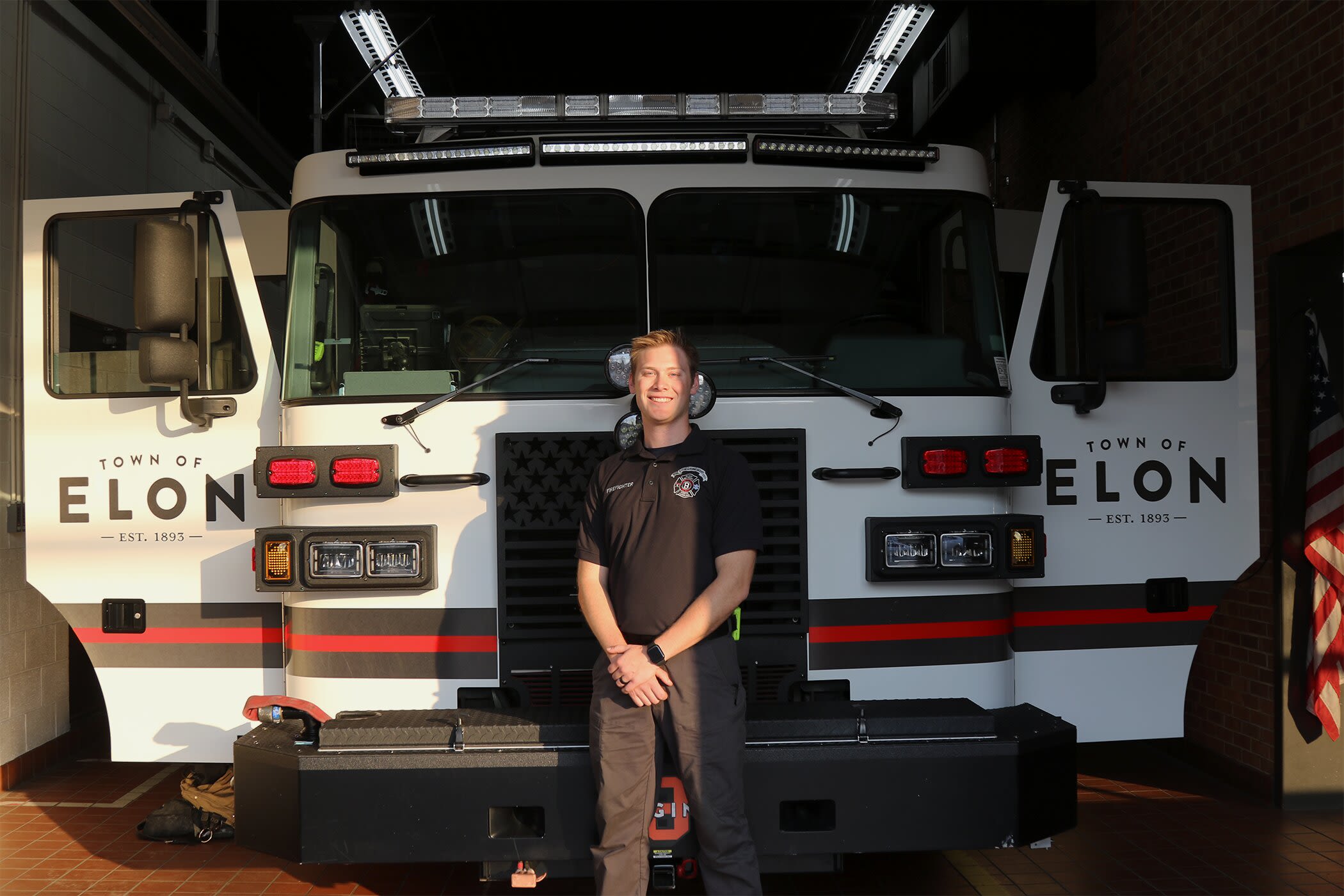 Grady Hildebrand poses in front of a Town of Elon Fire Department firetruck.