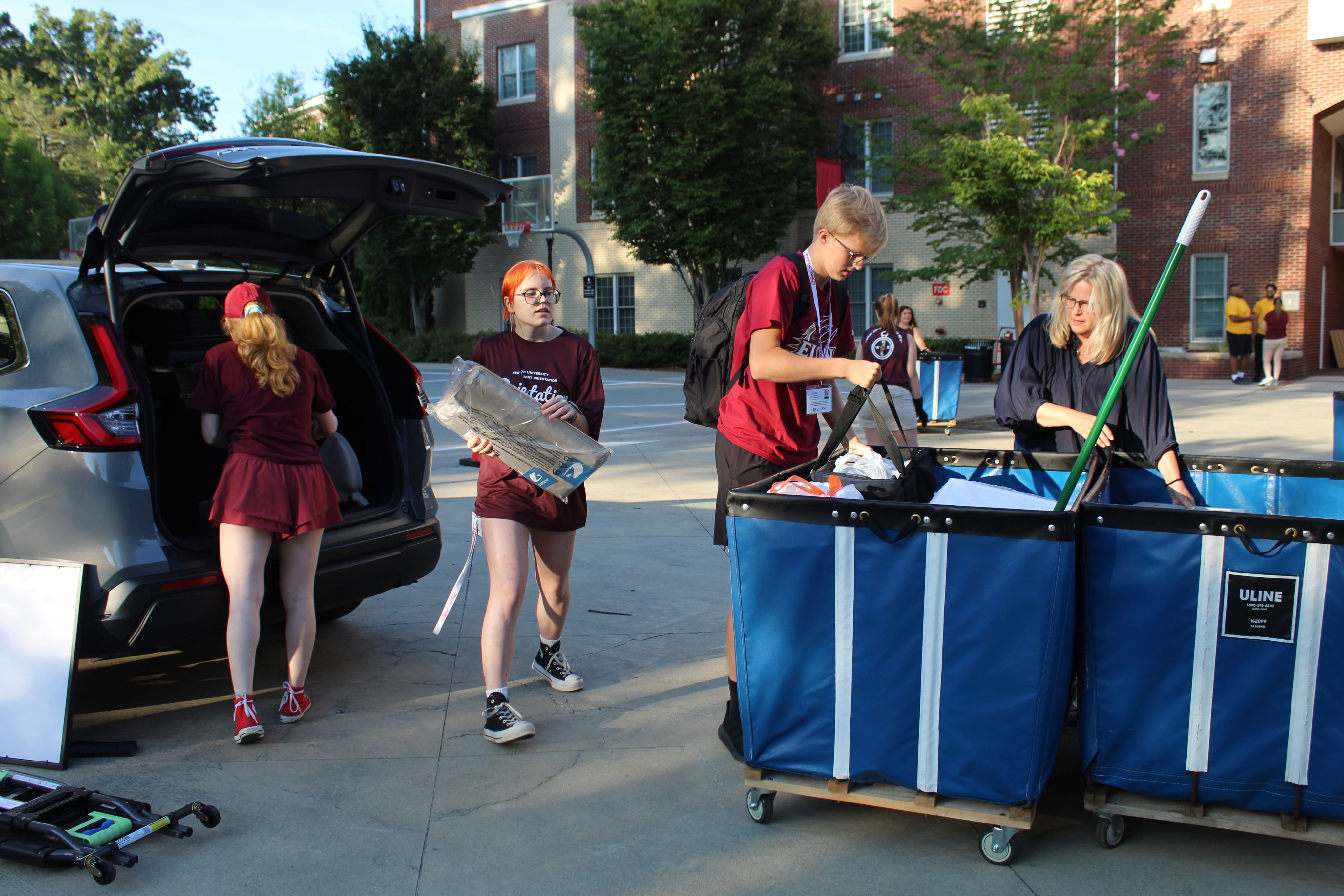 Freshman J.T. Loveless and his mother Sandy, unload their car in the Global neighborhood with the help Orientation Leaders. Photo by Nia Bedard.