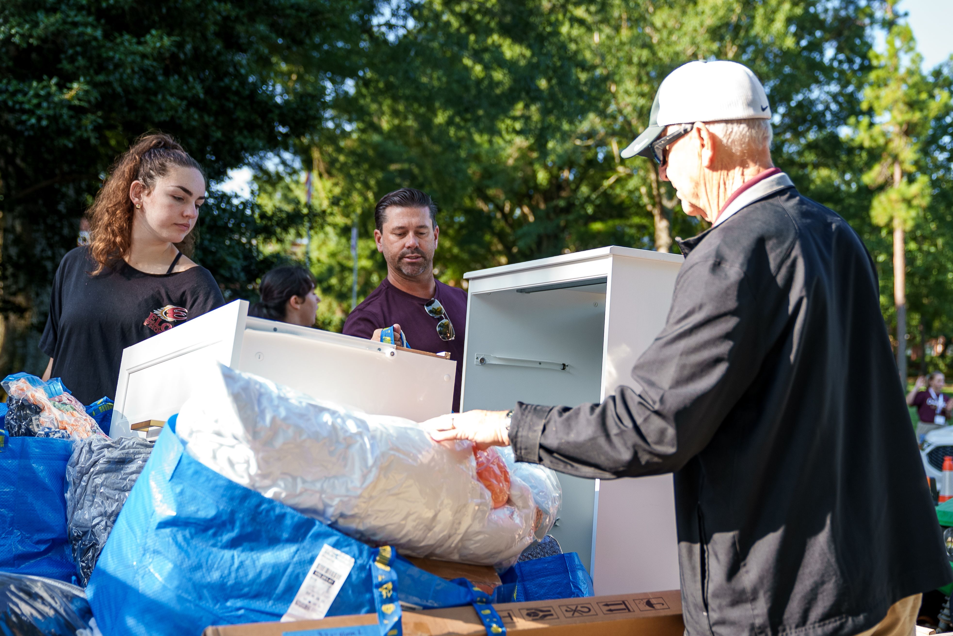 Student volunteers, athletes, resident advisers and orientation leaders help with move-in on Aug. 23 in the Historic Neighborhood. Photo by Ethan Wu.