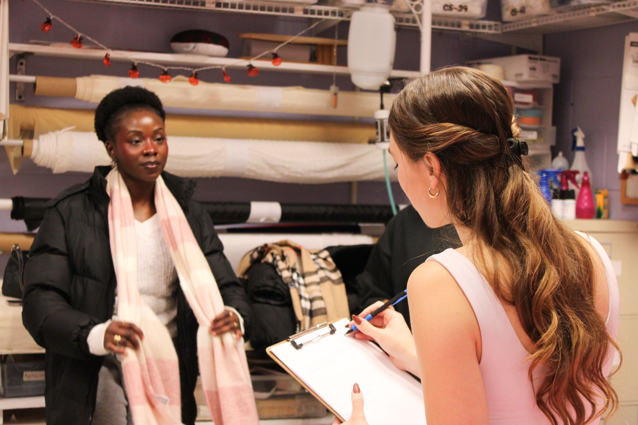 Brooke Gustafson (right) talks with a client at the Dec. 1 Fitting Futures event at the Elon Costume Shop. Photo by Megan Walsh