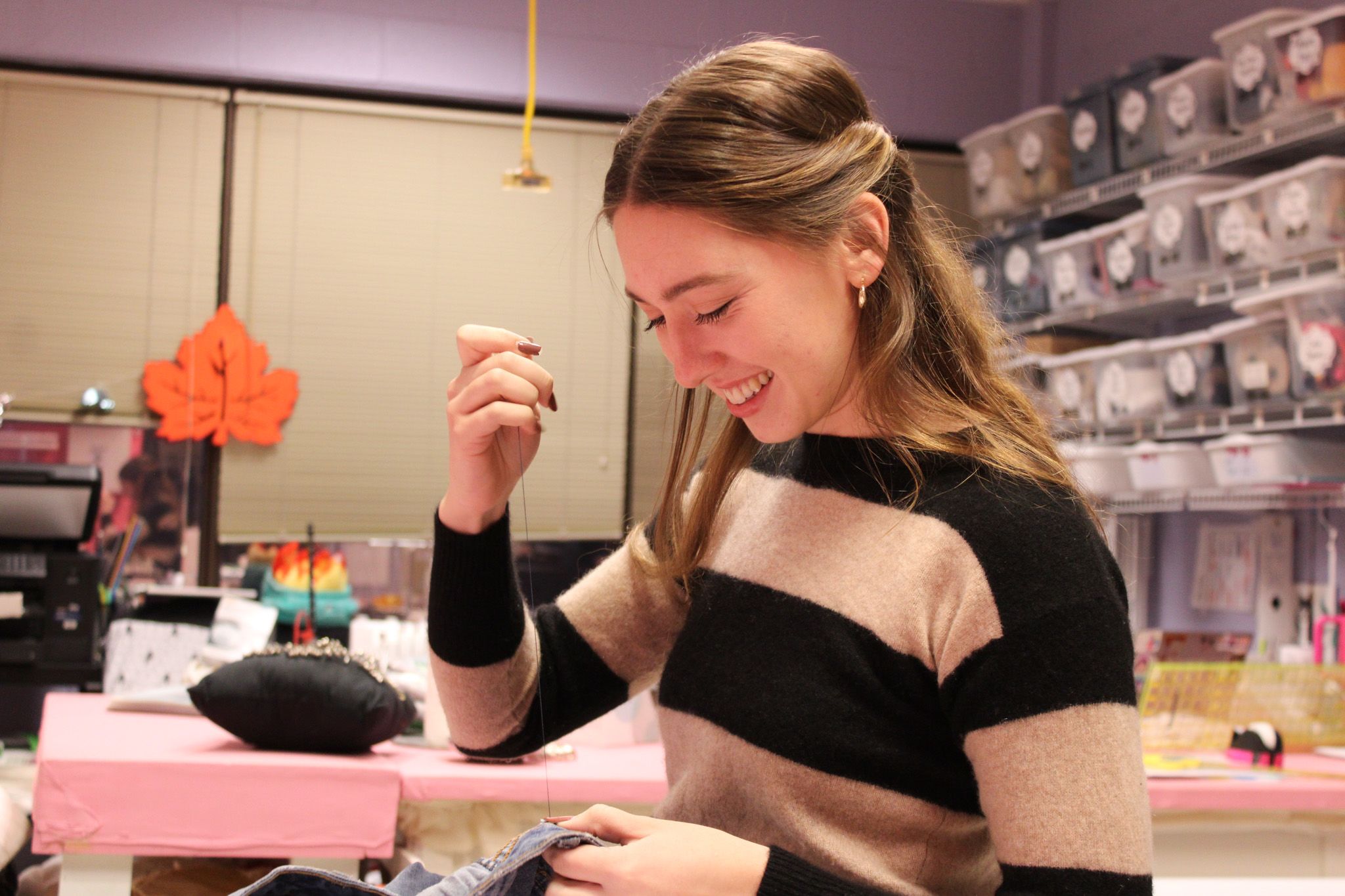 Brooke Gustafson sews a client's pair of jeans where the belt loop had detached at the Fitting Futures event Dec. 1 in the Elon University Costume Shop. Photo by Megan Walsh