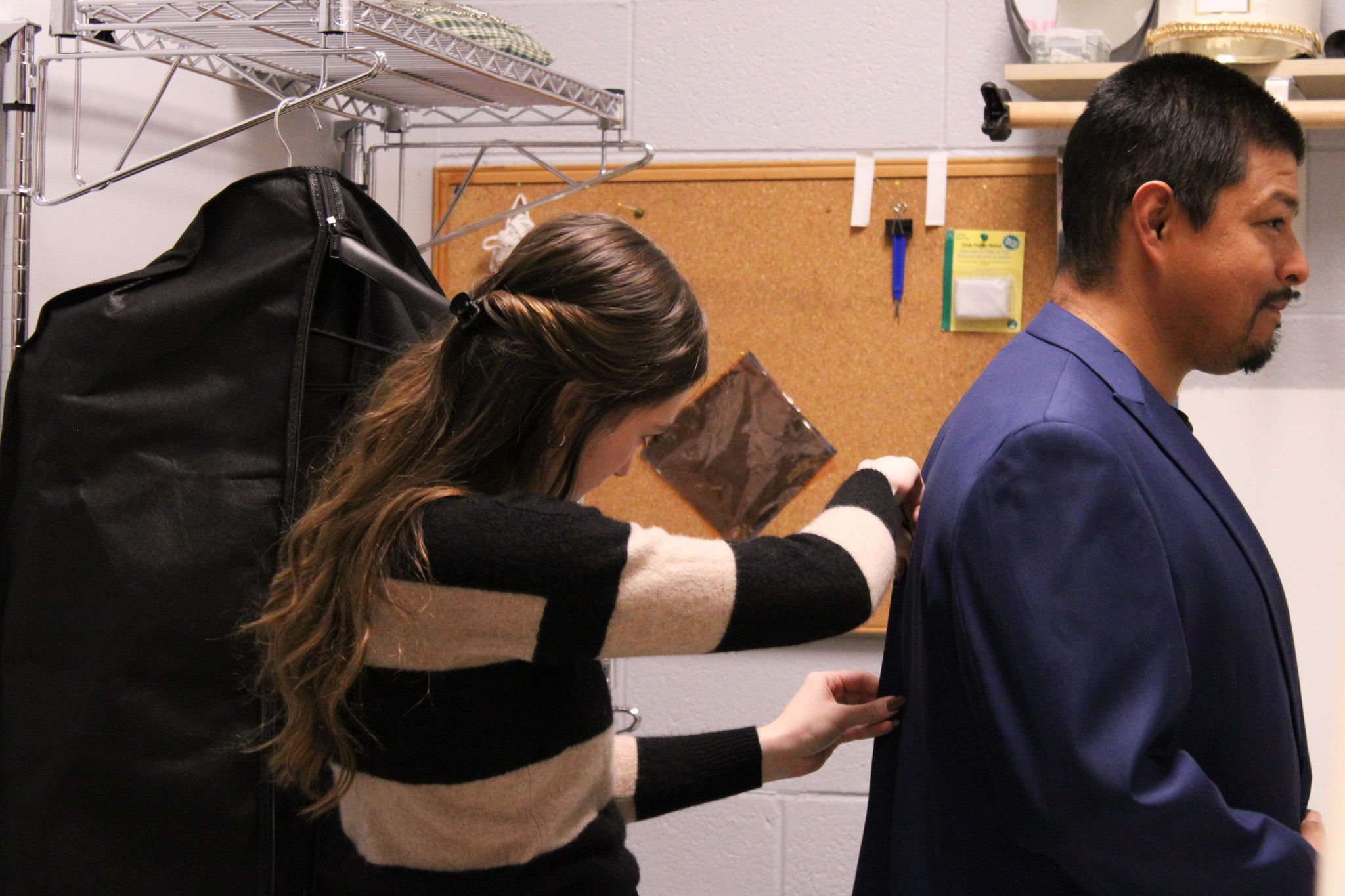 Brooke Gustafson marks and pins the back of a client's suit jacket at the Fitting Futures event Dec 1. at the Elon Costume Shop. Photo by Megan Walsh