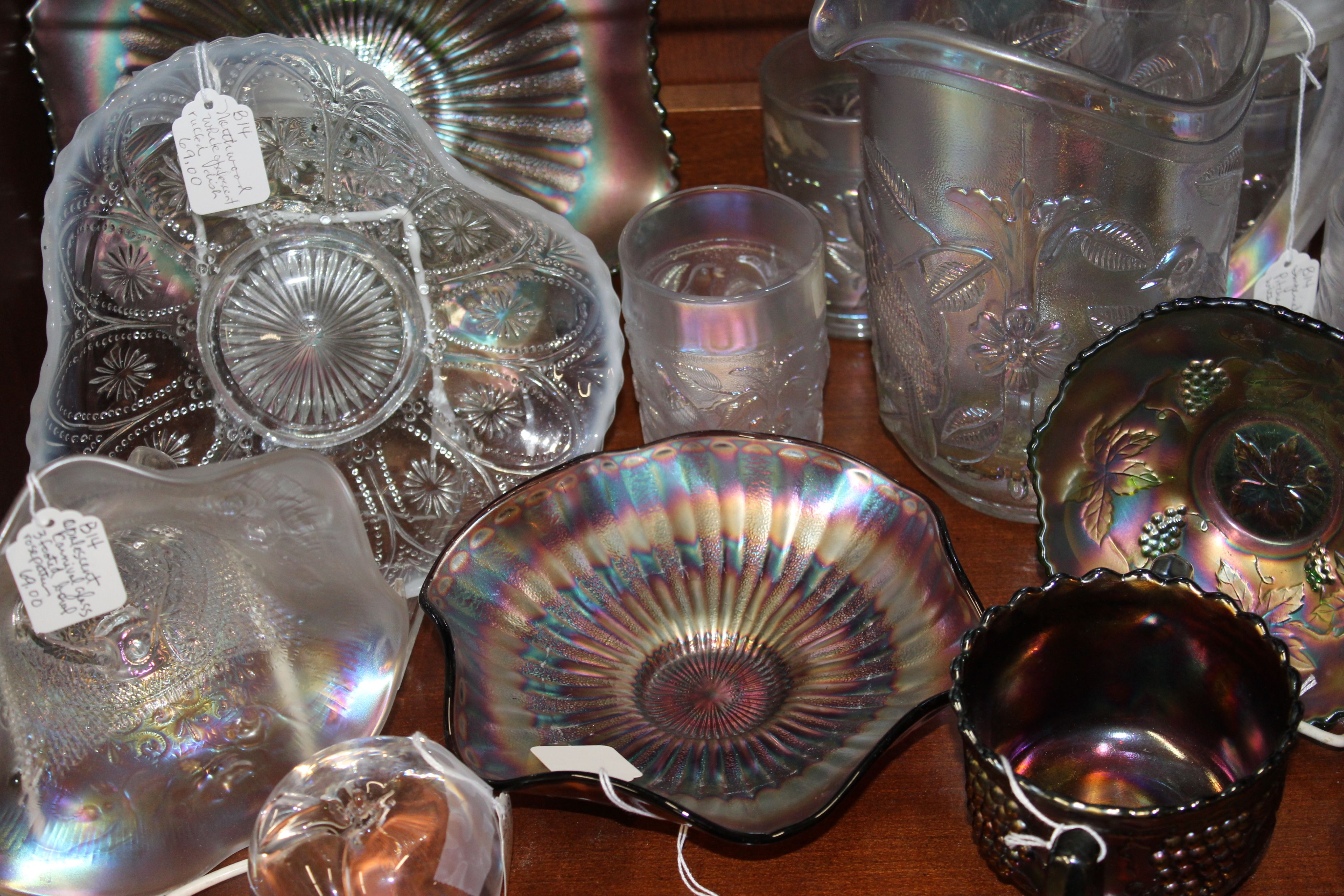 At the shop today, Myra and Jim distribute glittering displays of Depression glass, etched in lattice patterns and glowing in crimson, amethyst, and opaque white.