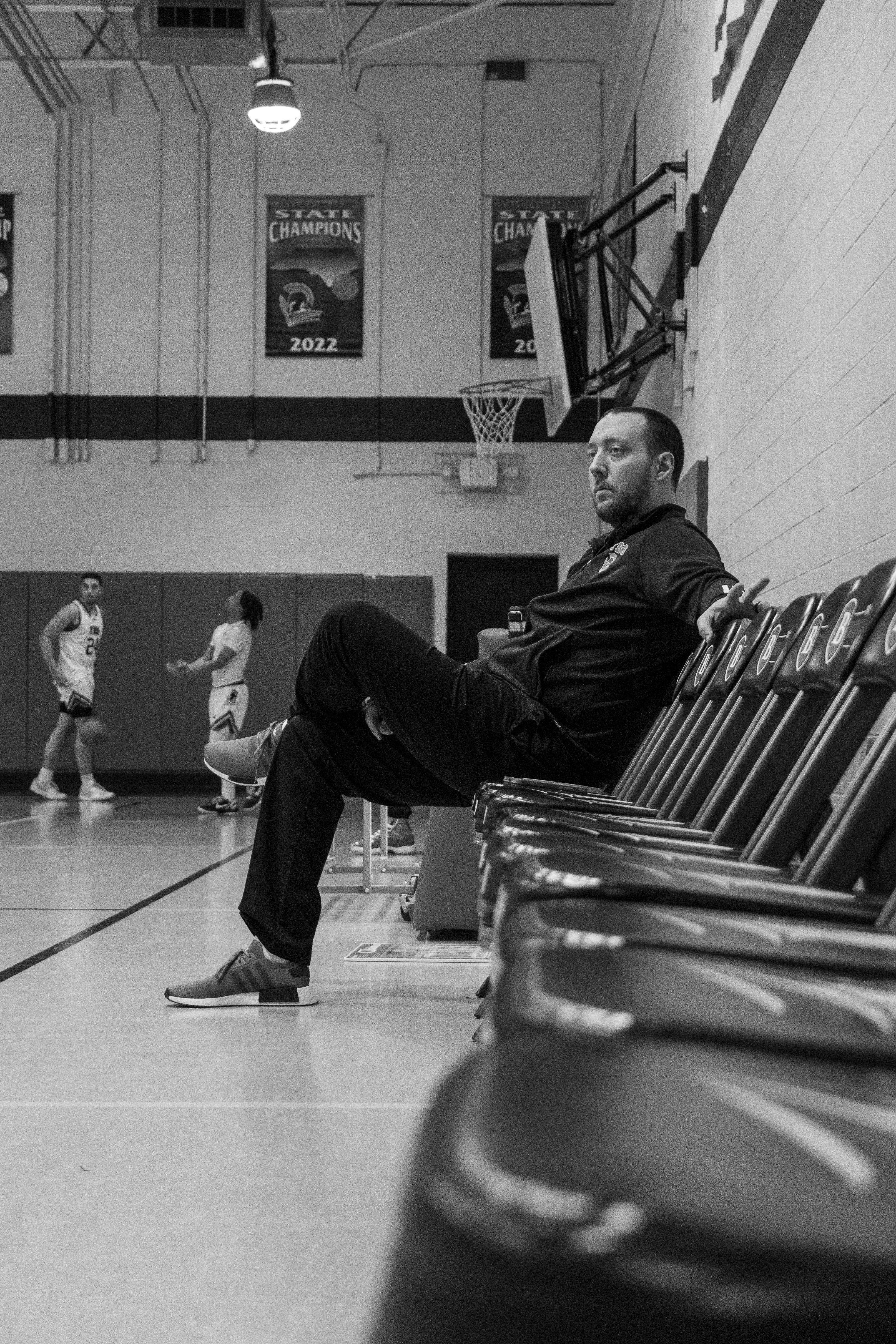 TBS head coach George Marshall sitting on the bench pregame. 2/18/2025. Photo by Cap Henneman.