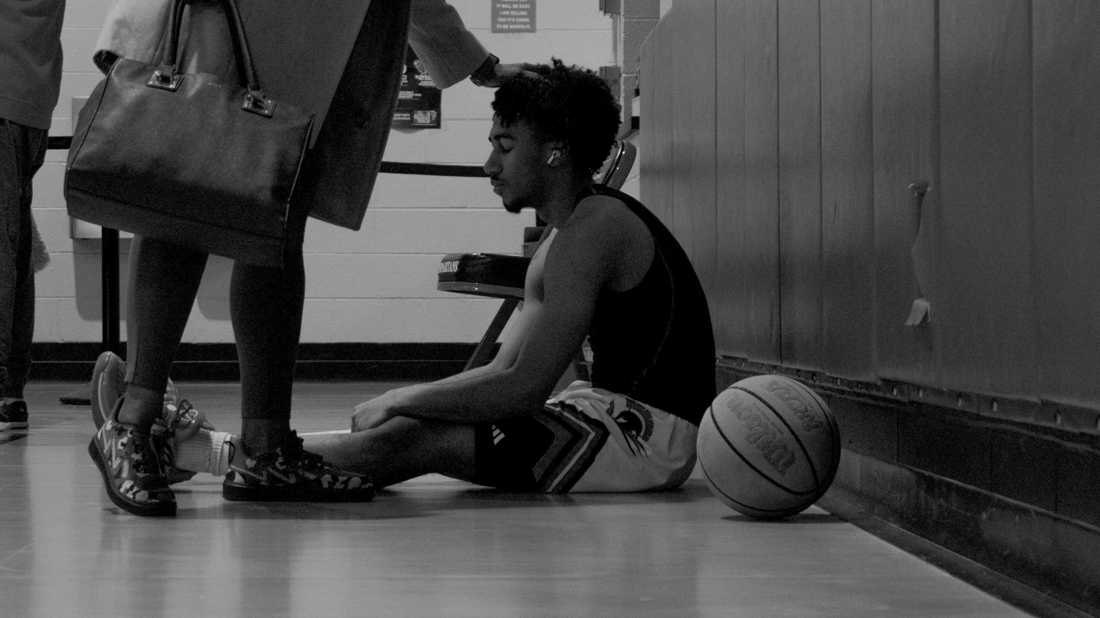 Junior Drew Johnson is led by a parent in prayer before a playoff game. 2/15/2025. Photo by Cap Henneman.