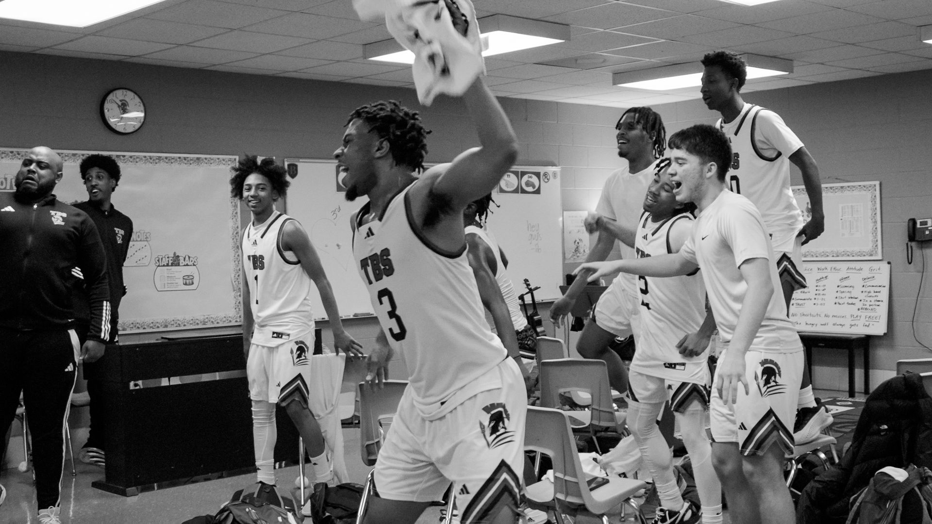 TBS players and coaches celebrate in the locker room following their Final Four win vs. Harrell's Christian Academy. 2/18/2025. Photo by Cap Henneman.