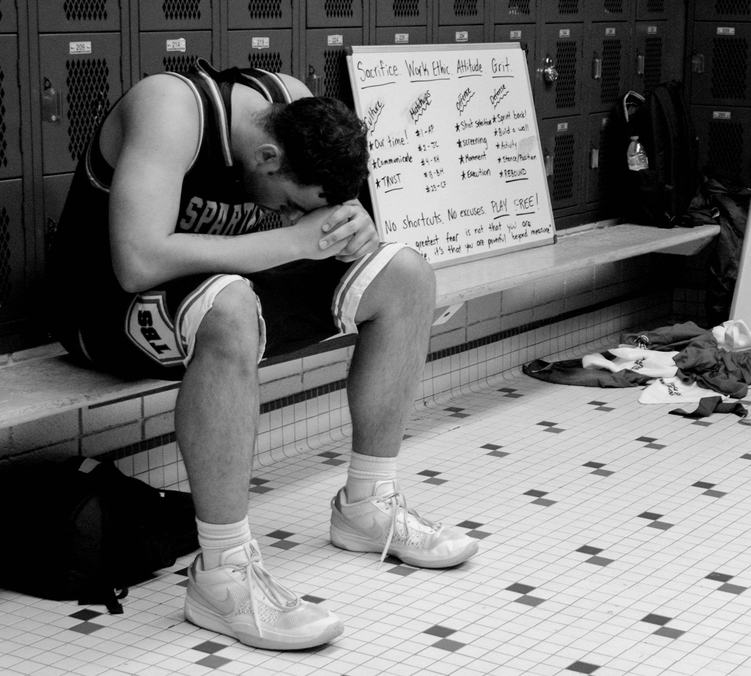 Senior Kaden Hammond sits in the locker room following the loss to Caldwell Academy in the State Championship. Photo by Cap Henneman.