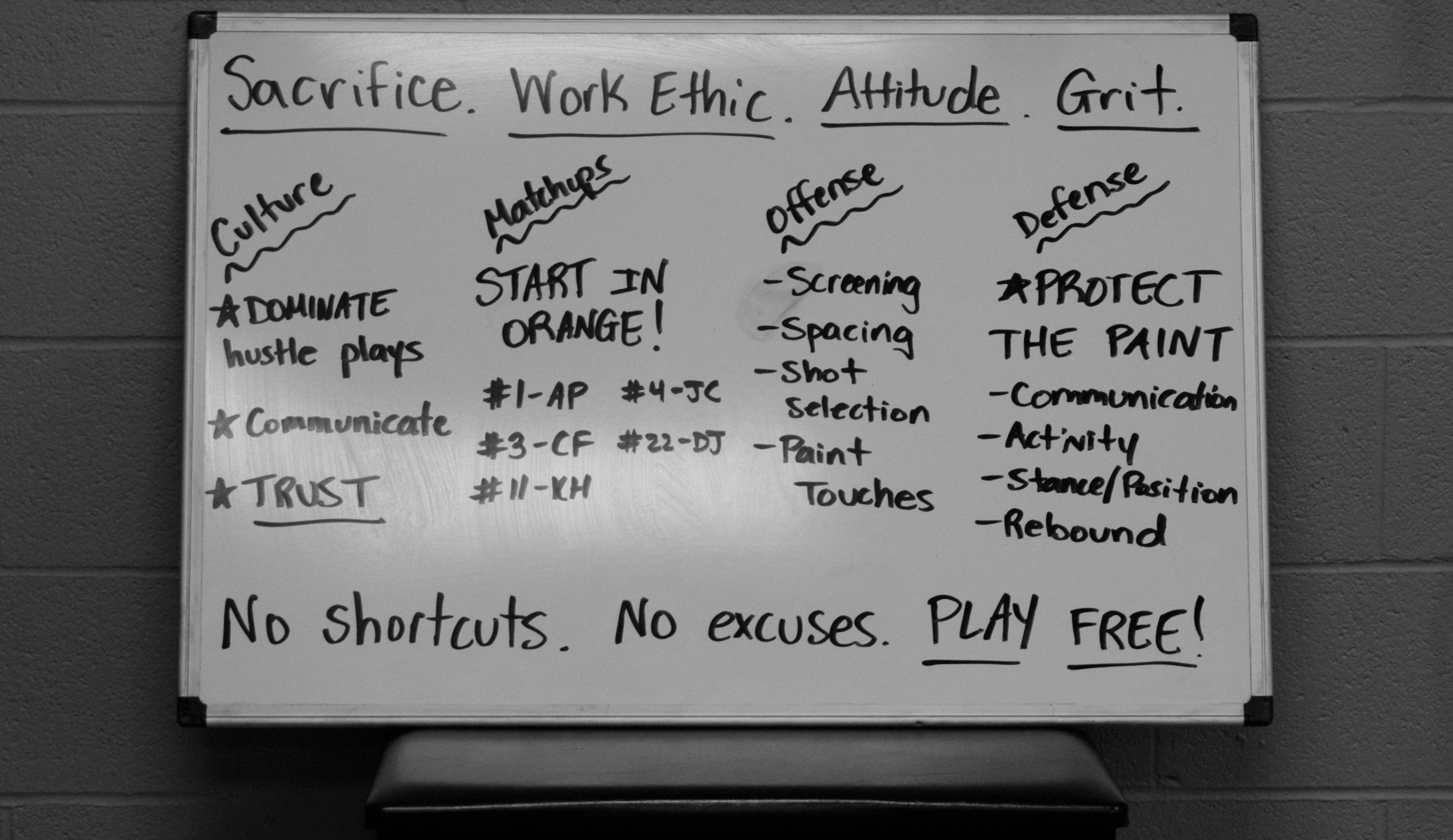 The team whiteboard in the locker room displaying the game plan and values before their first playoff game. 2/15/2025. Photo by Cap Henneman.