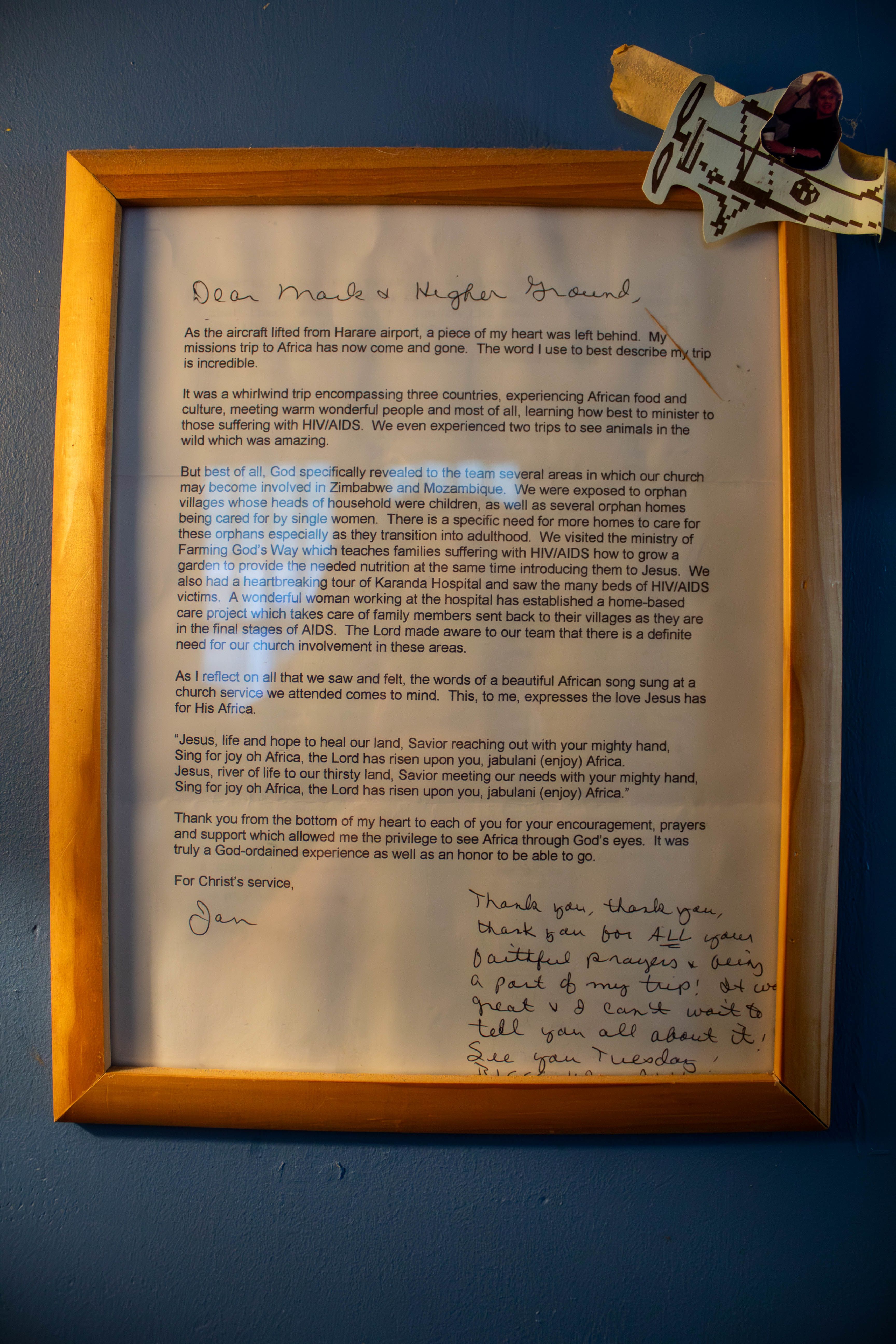 En Higher Ground, el 17 de noviembre, una carta cuelga de la pared, en la que se detalla la experiencia de un misionero que trató a personas con VIH/SIDA en África. Foto de Nia Bedard.