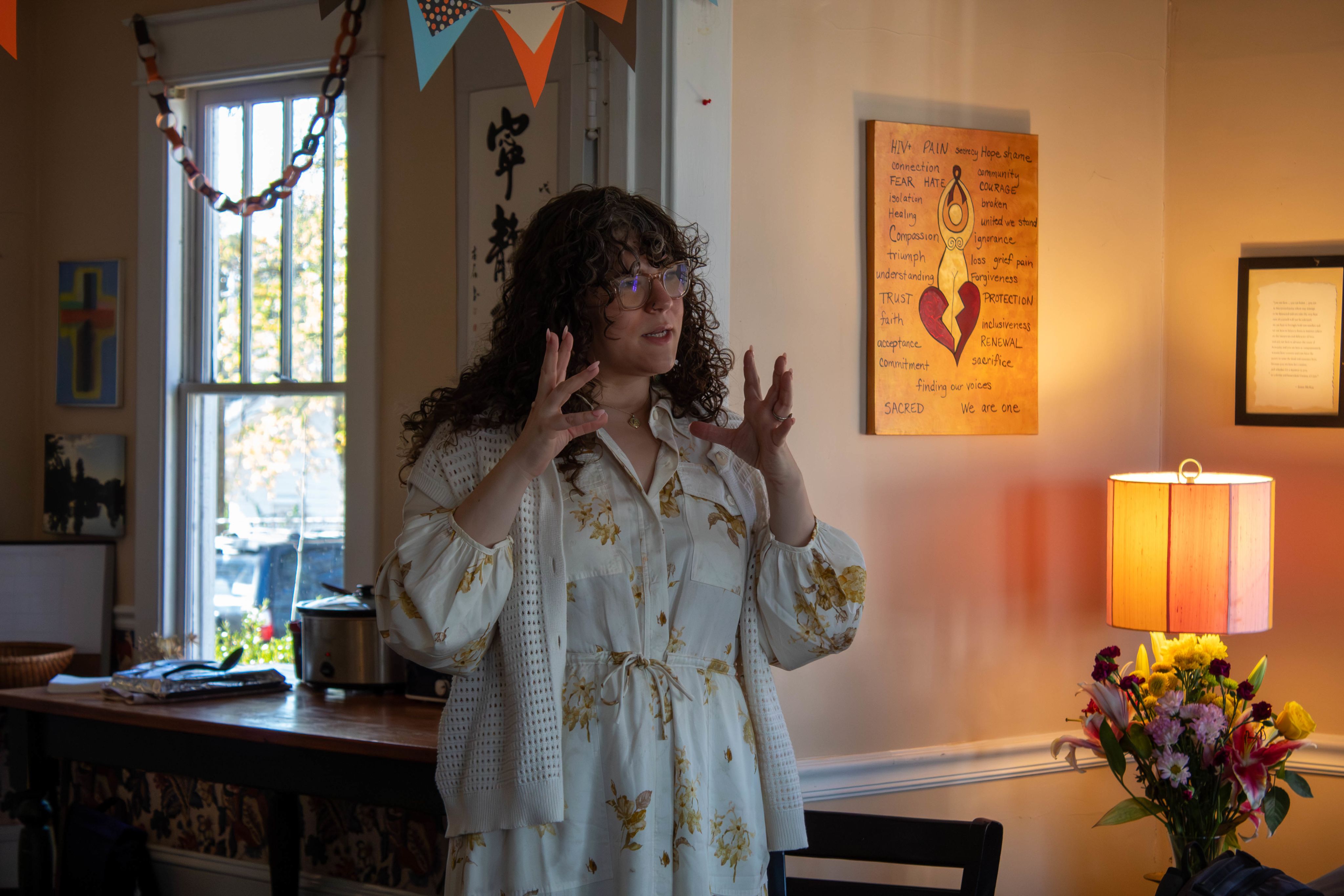 La directora ejecutiva del Triad Health Project, Adriana Adams, habla con los miembros del equipo durante una reunión comunitaria en Higher Ground el 17 de noviembre. Foto de Nia Bedard.