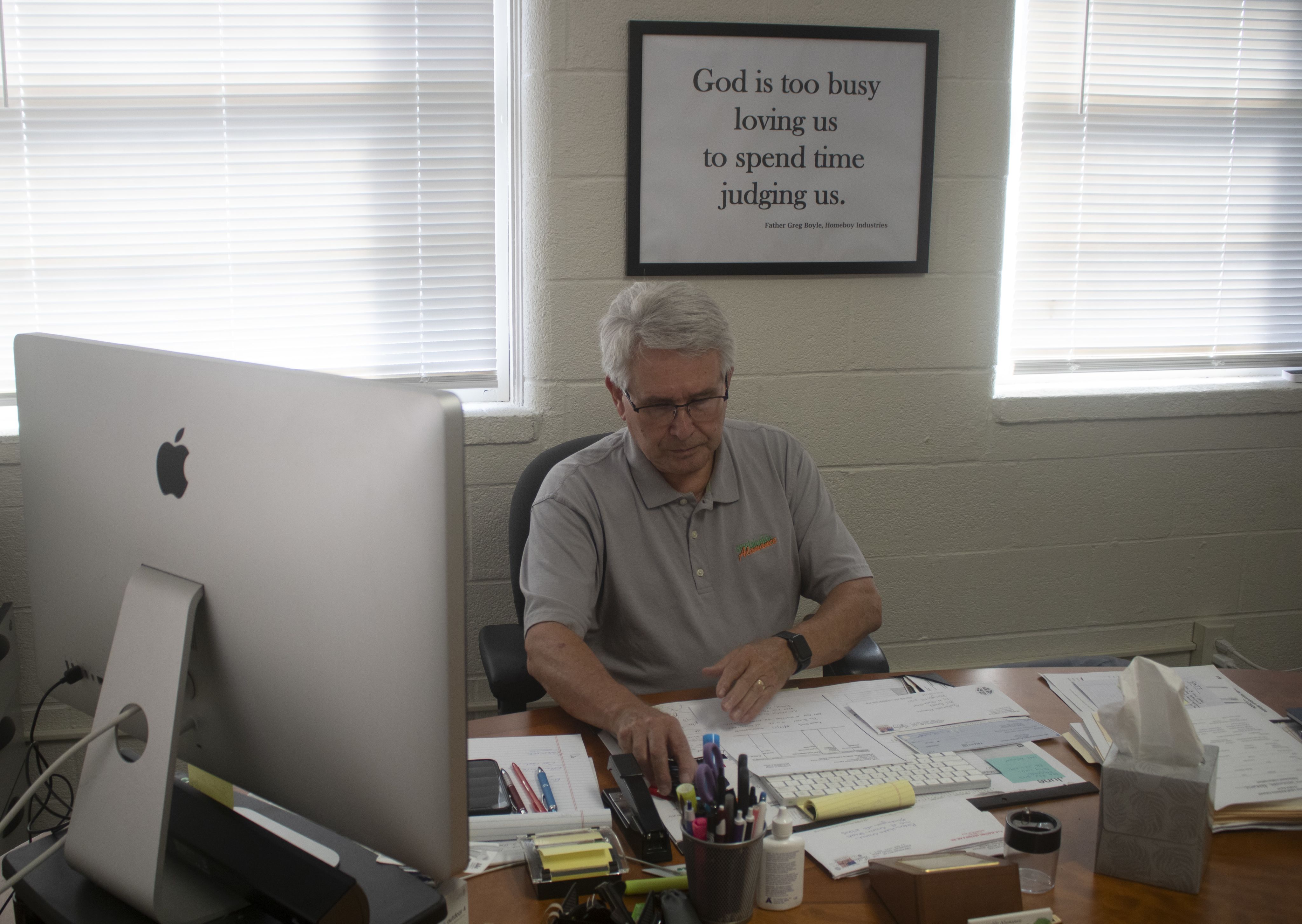 Bowers sorts through documents in his office on Sept. 30 in Burlington’s Beverly Hills Community Church. According to Bowers, the budget that the state spends on just three criminal offenders recidivating would be enough to fund Sustainable Alamance for a year.