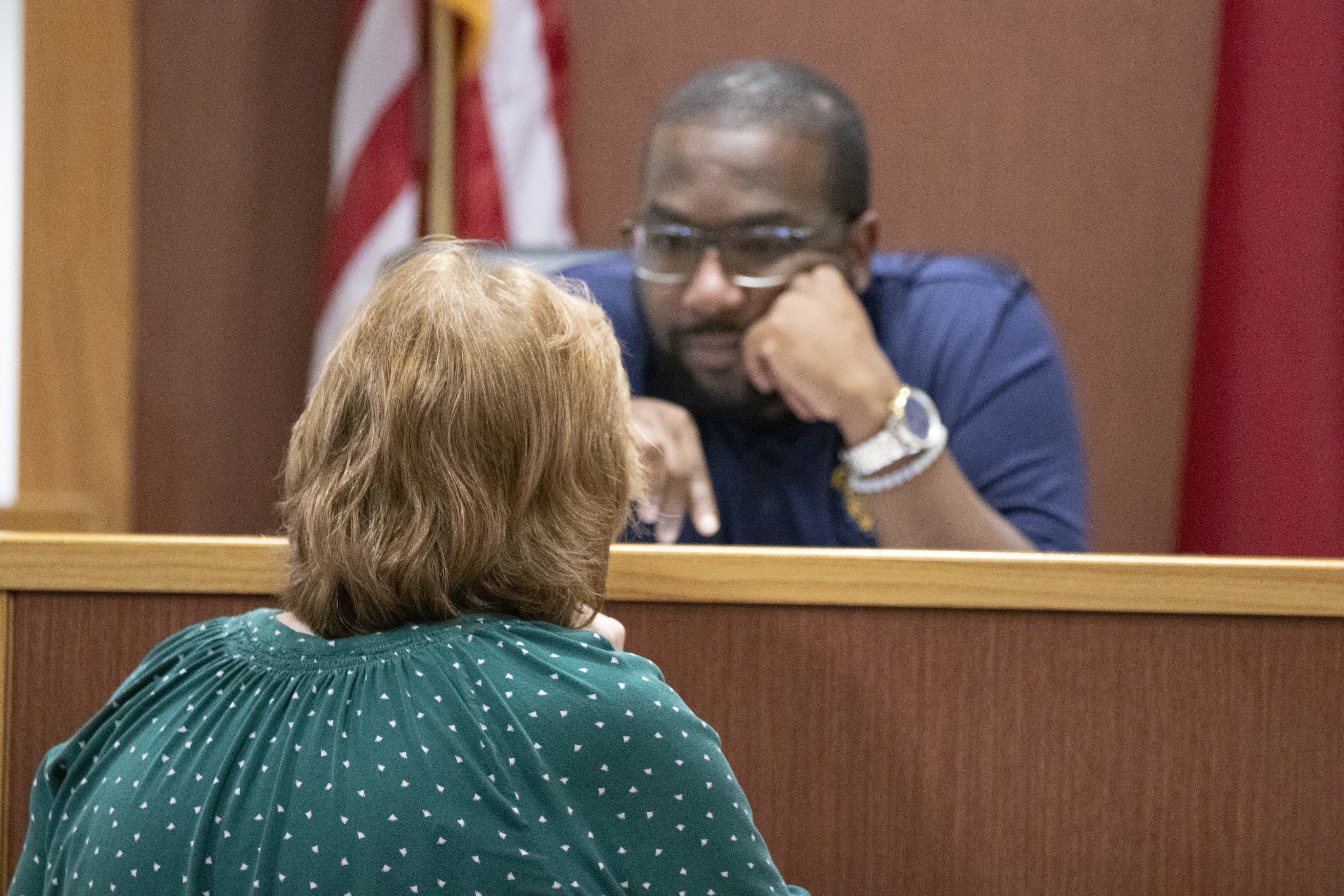 Teen Court Judge Roy Dockery speaks to Alamance County Teen Court Program Manager Michelle Carey on Oct. 14 at the Graham Civil Courthouse.