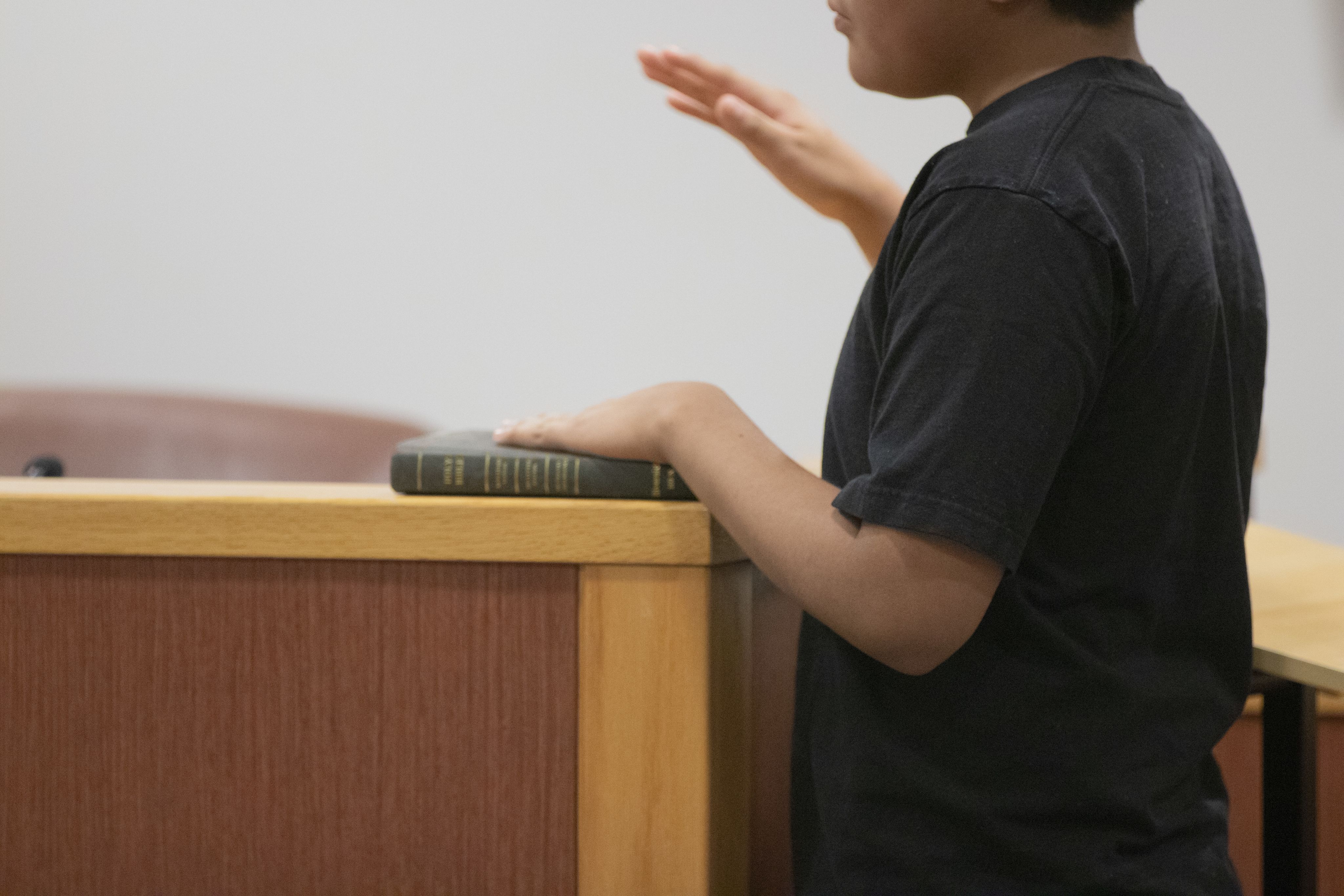 A juvenile offender swears on the Bible to tell the truth as they are called to the courtroom stand on Oct. 14 at the Graham Civil Courthouse in Alamance County.