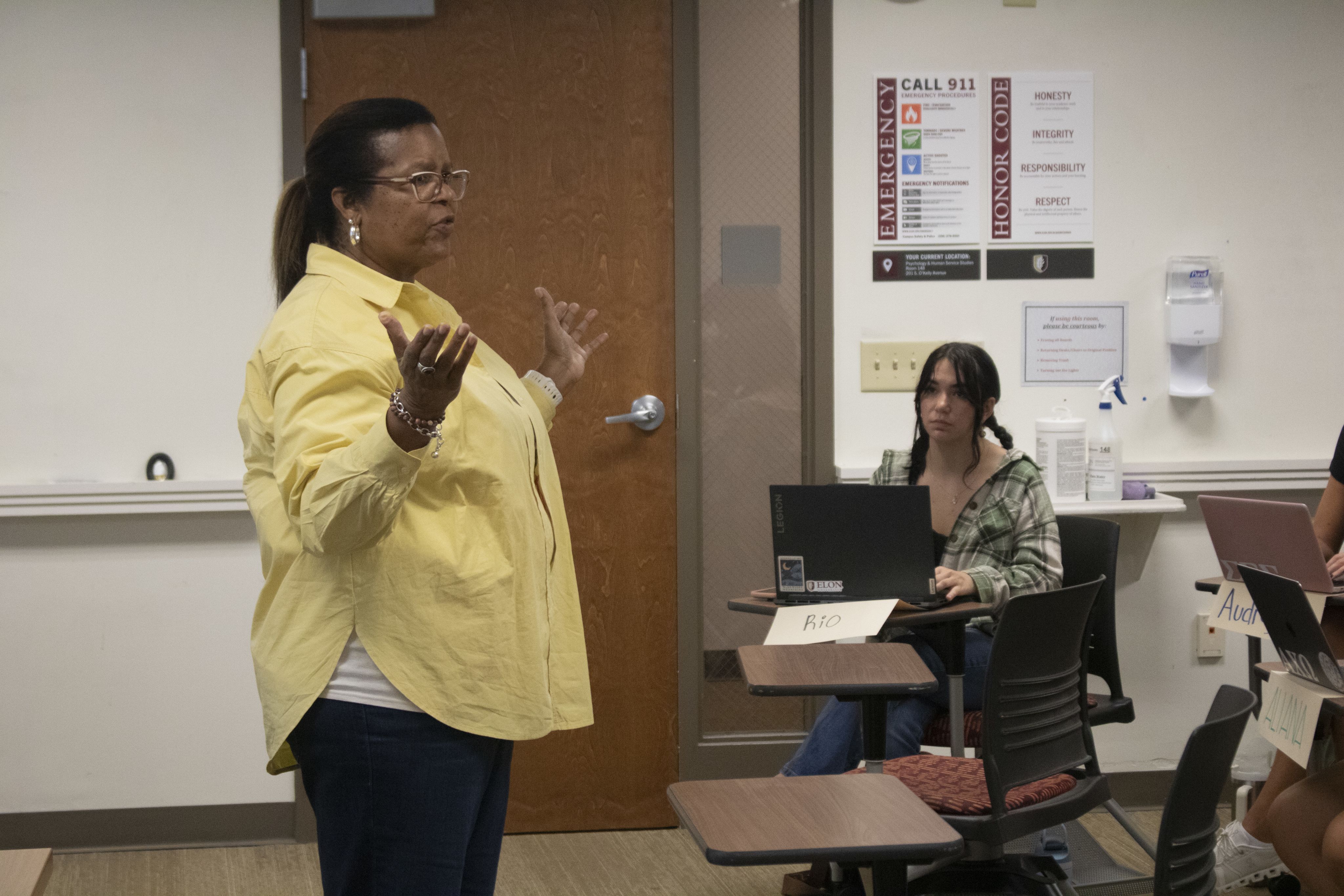 Elon University professor Sandra Reid starts her juvenile justice class on Sept. 26 in Elon’s psychology building.