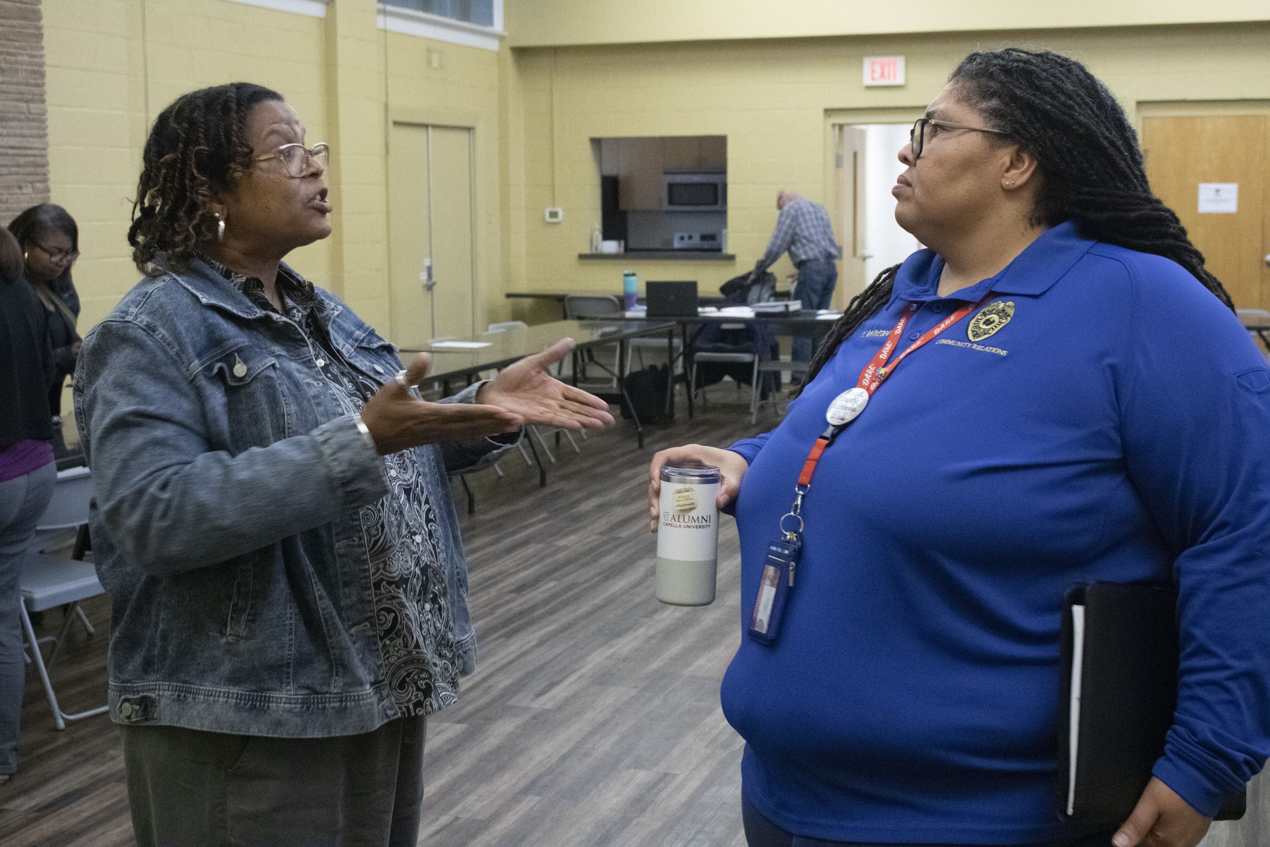 Sandra Reid speaks with Yolanda Whitted, youth intervention and diversion coordinator for the Burlington Police Department, at Alamance County’s Juvenile Crime Prevention Committee meeting on Sept. 17 at the Graham Civic Center.