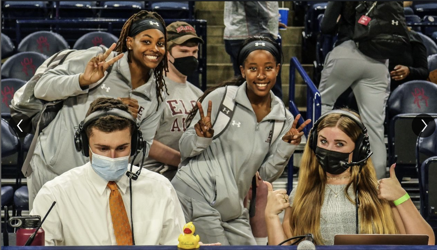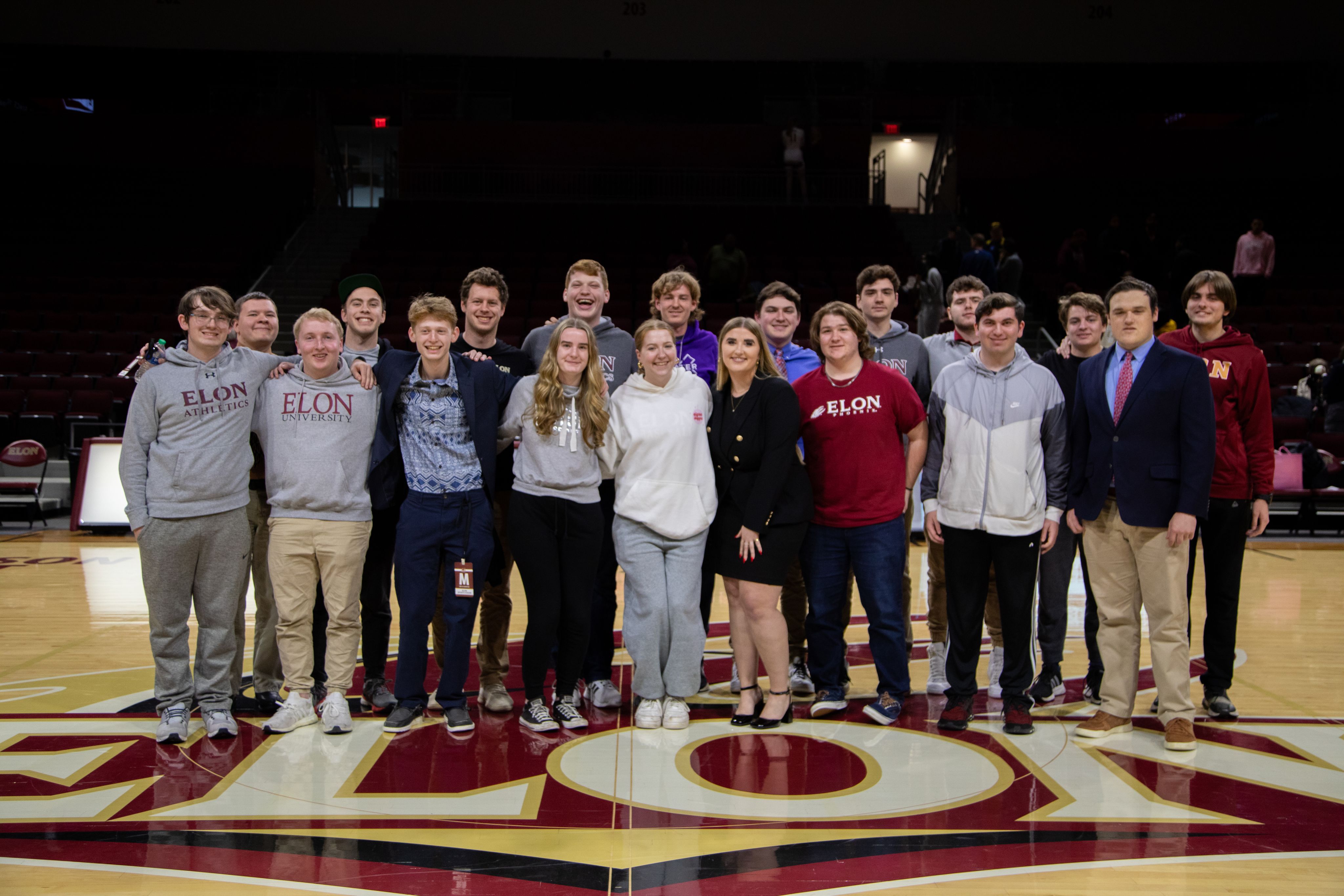 Photo Credit: Elon Athletics- Bennert, to the right, alongside members of the Elon Women's Basketball team after a broadcast.