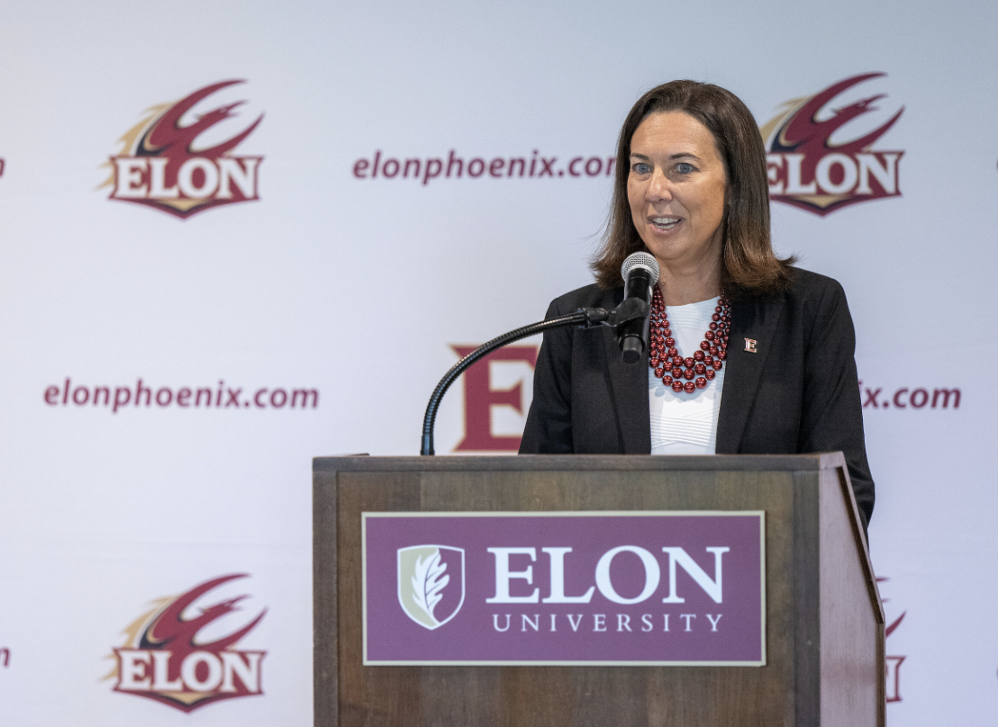 Photo Credit: Elon University- Jennifer Strawley addresses the Elon community after being hired as Director of Athletics.