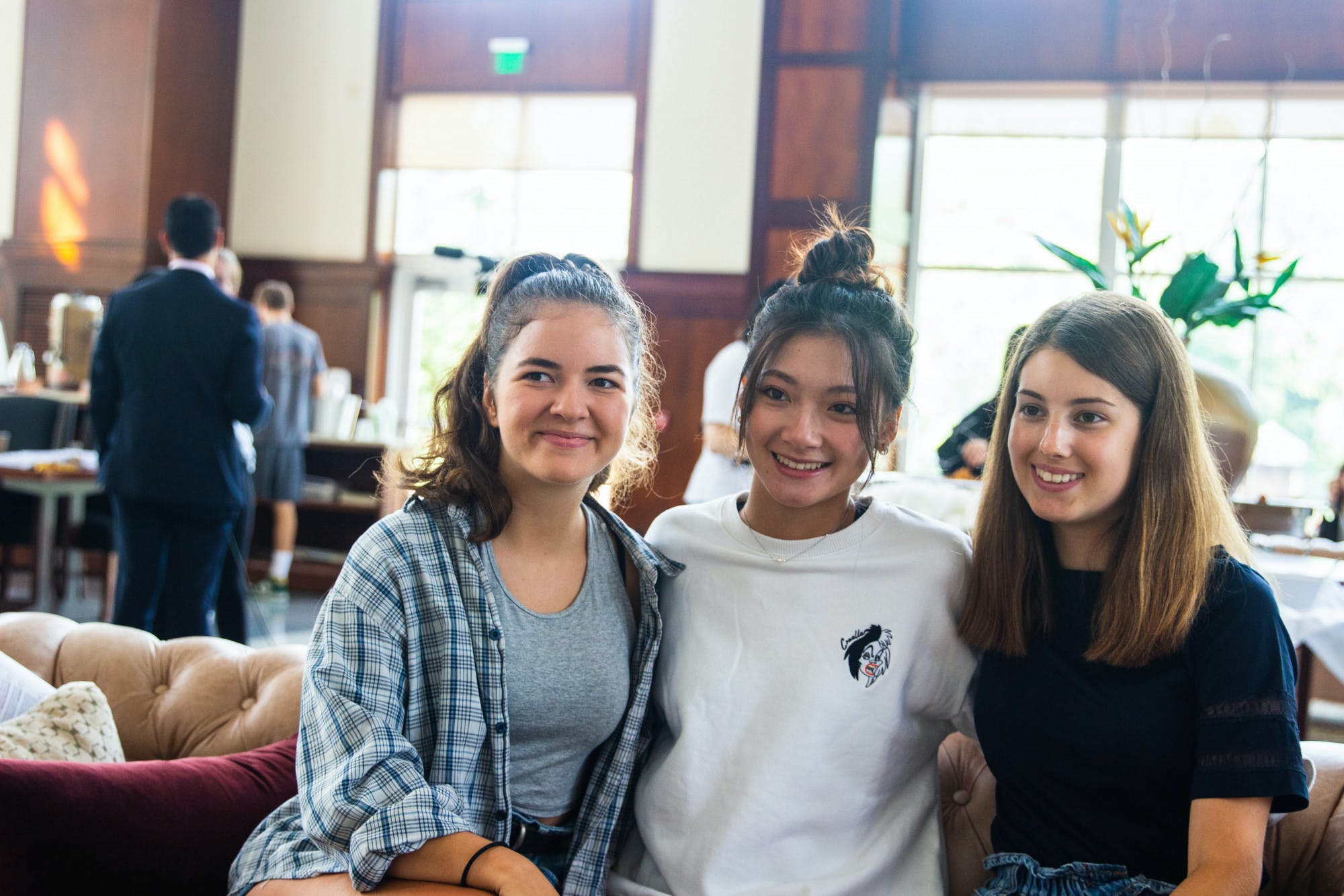Nina Lichtenberger and Johanna Lauff join Annie Wu at the International Student Orientation Closing Breakfast on Aug. 19. (Graysen Shirley)