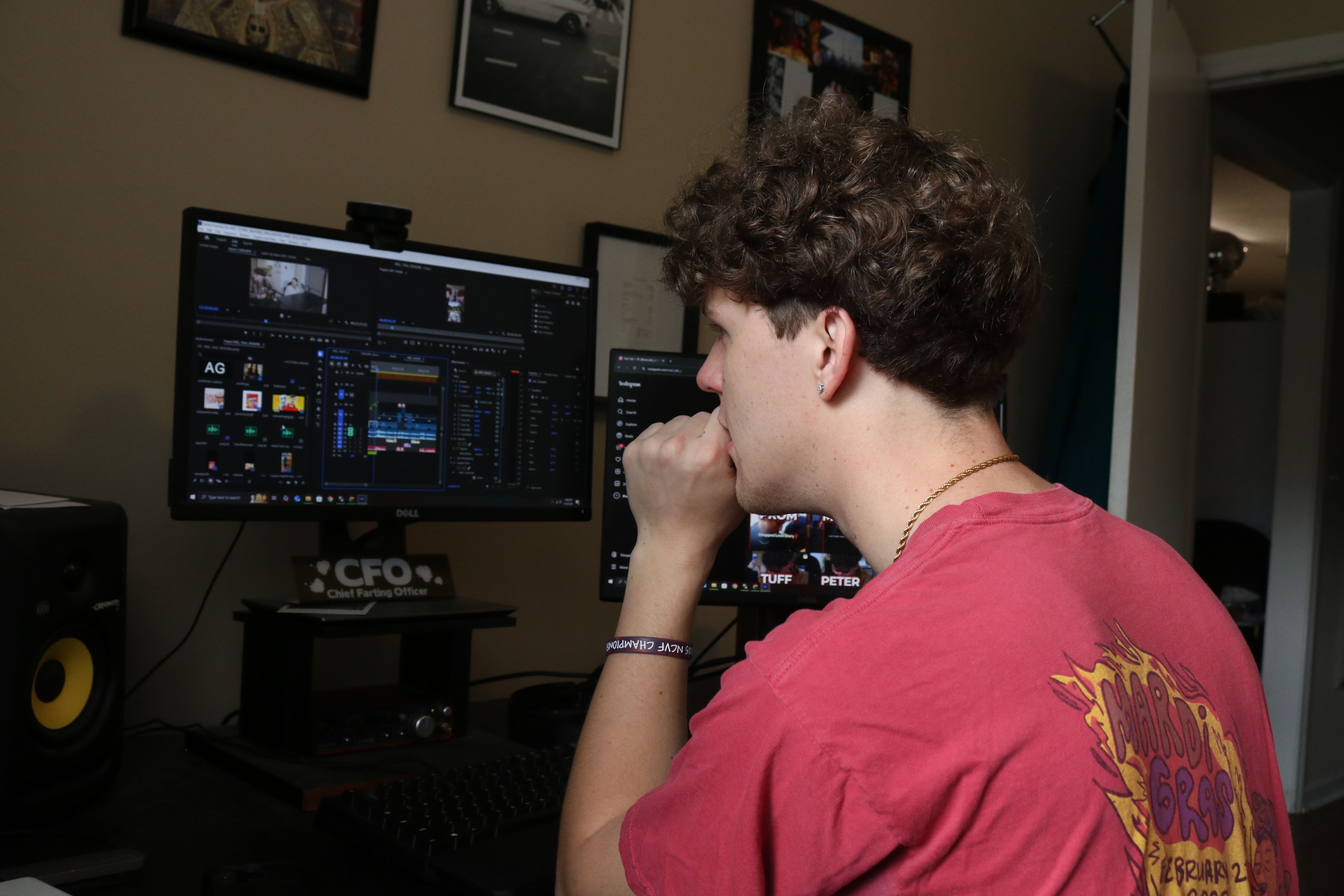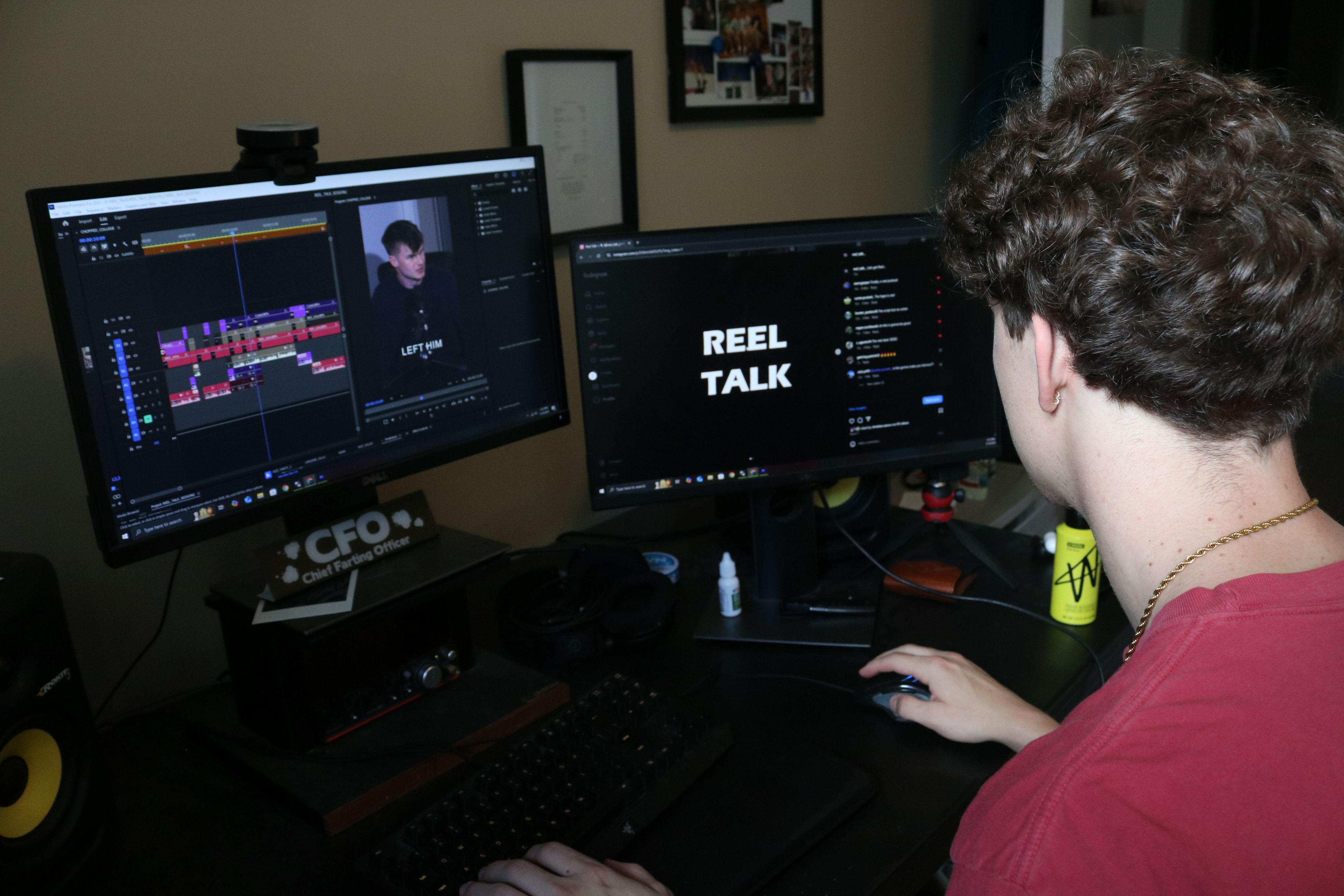 Elon University senior Mason Kaiser edits Reel Talk videos in his apartment bedroom on Adobe Premiere Pro on Sunday, May 18, 2025.