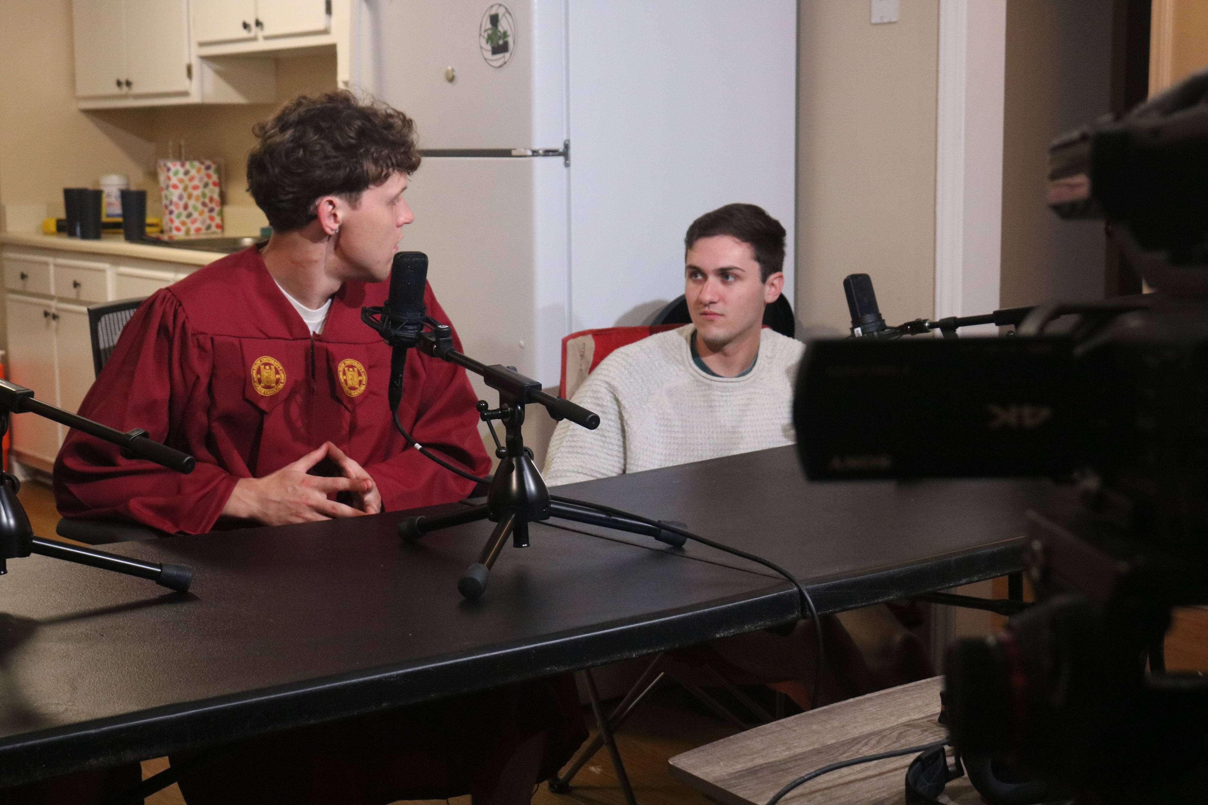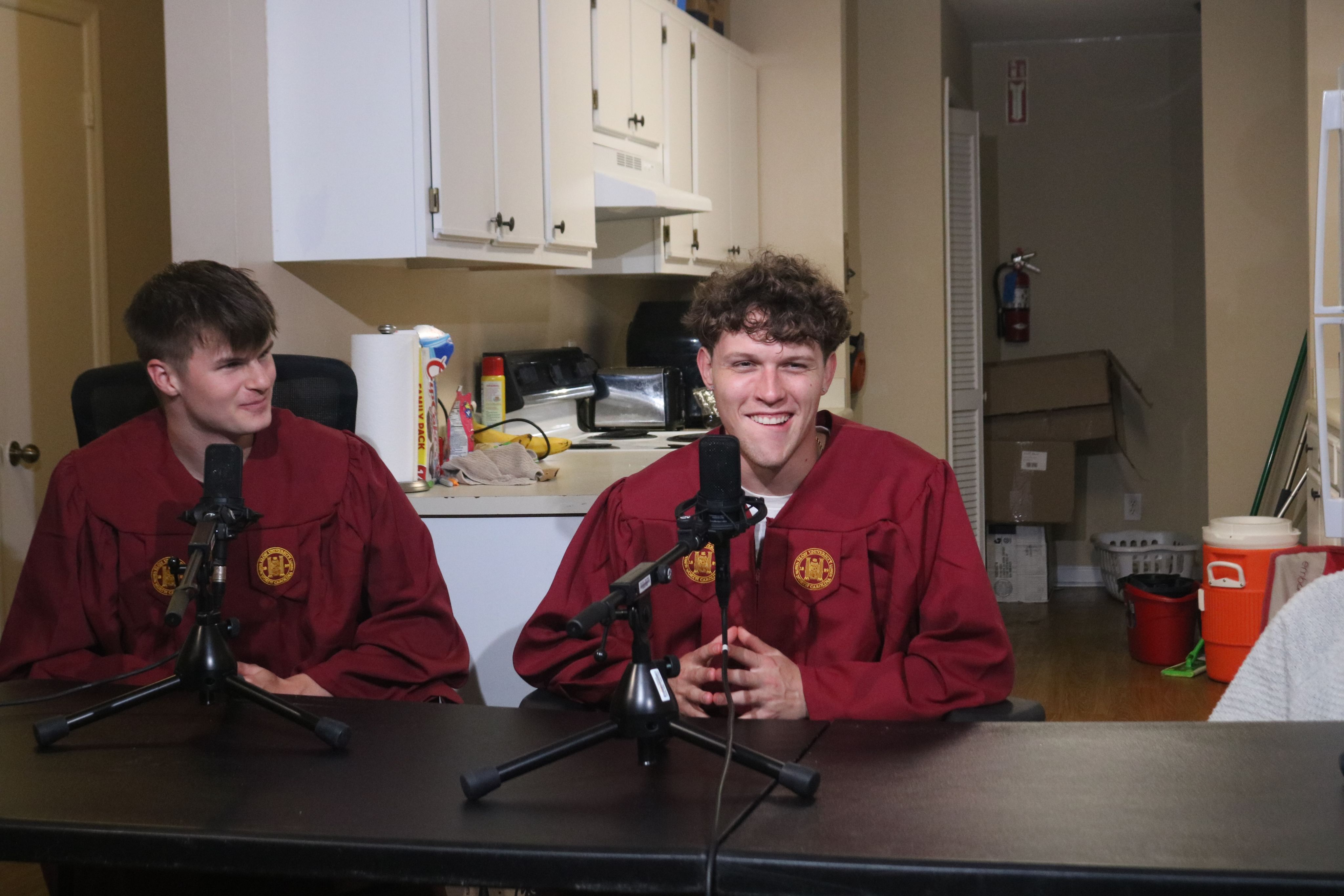 Elon University senior Mason Kaiser records an episode of Reel Talk with Christian 'Drip' Van Vorhees to his left. Dressed as Cardinals, the group discusses their picks for the next Pope on Tuesday, May 6, 2025.