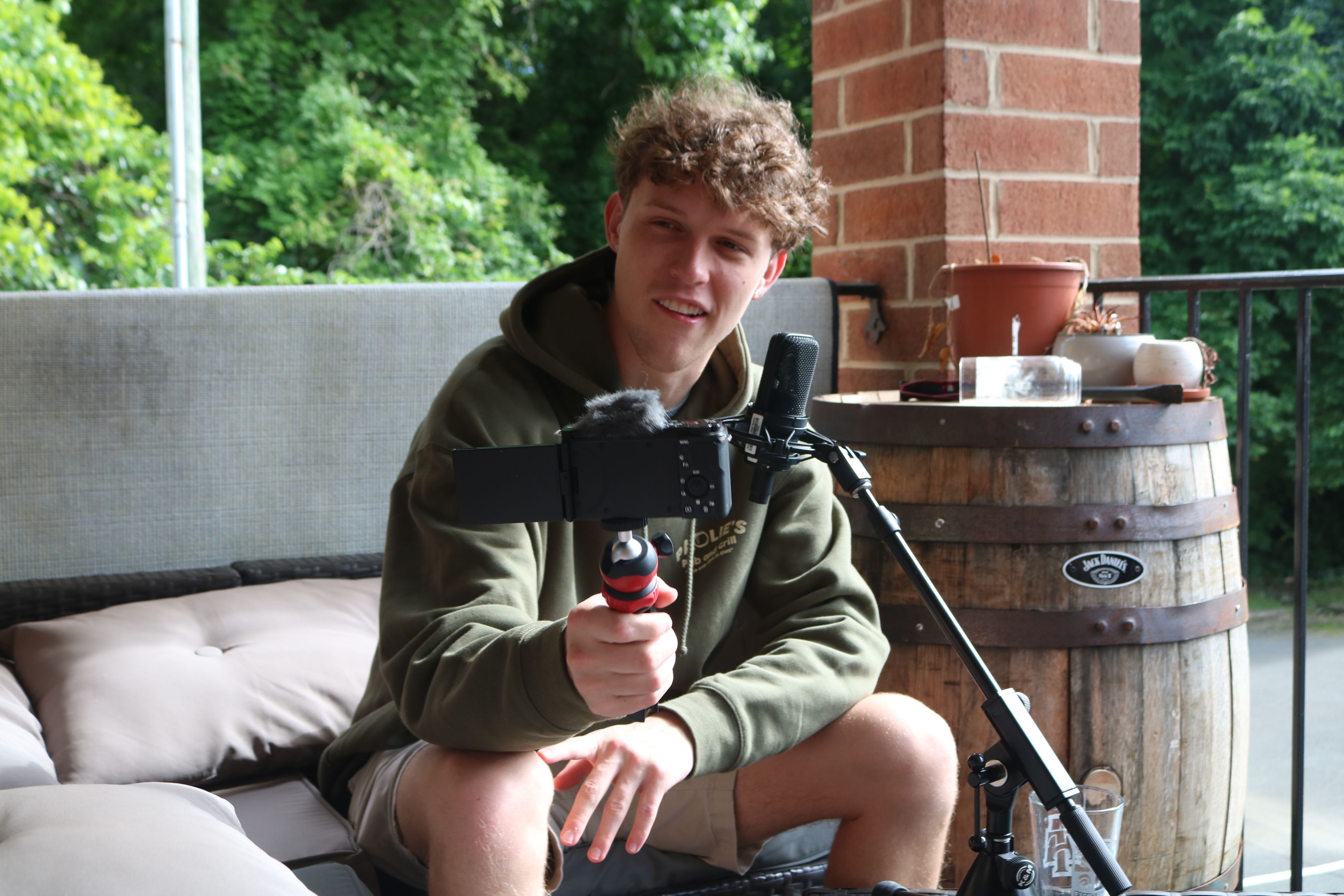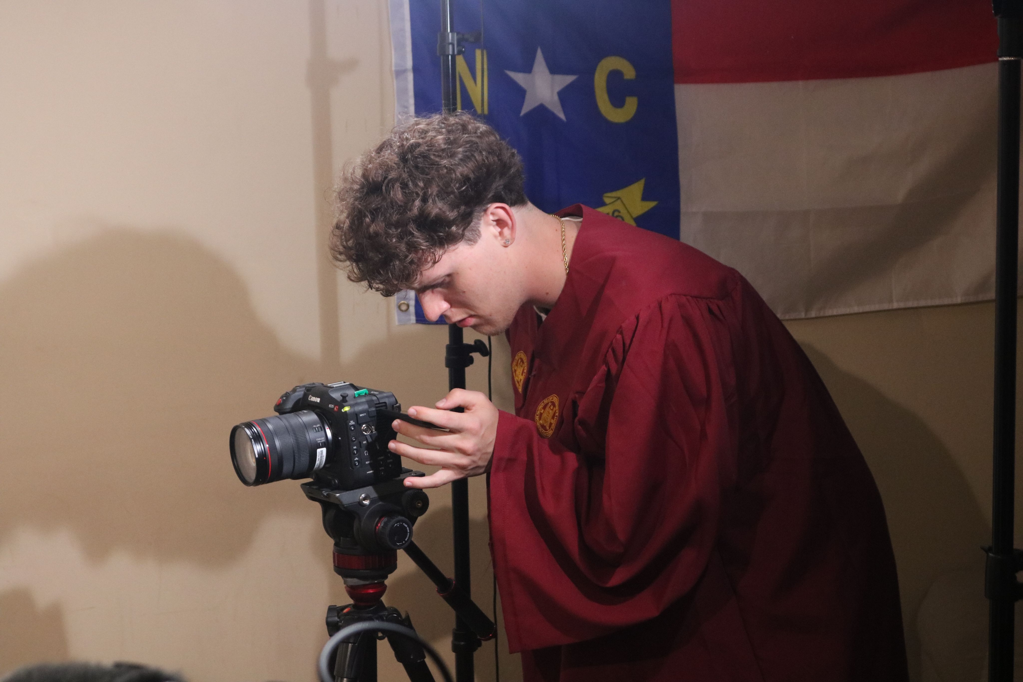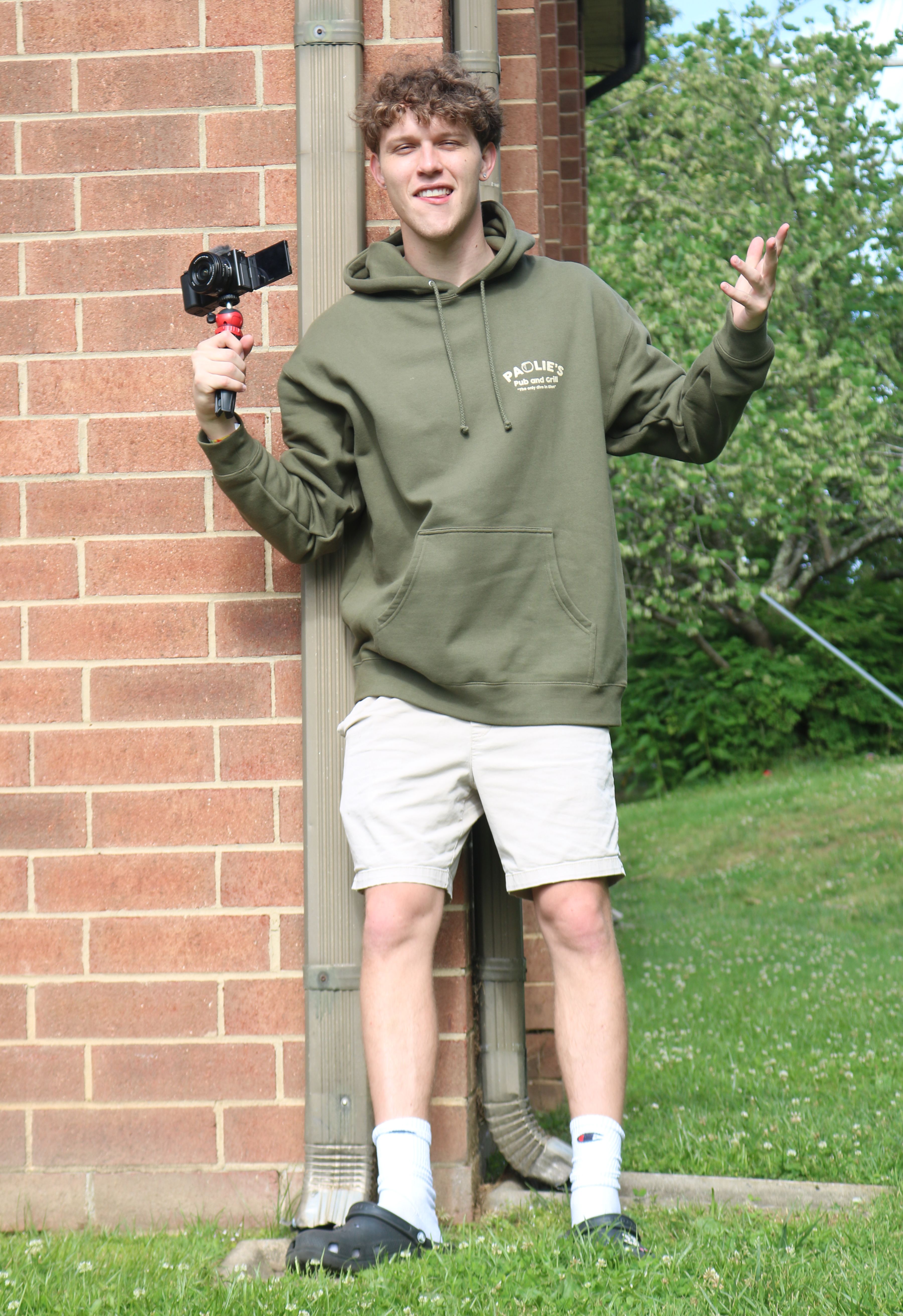 Elon University senior Mason Kaiser stands outside of his apartment with a handheld camera on Sunday, May 18, 2025.