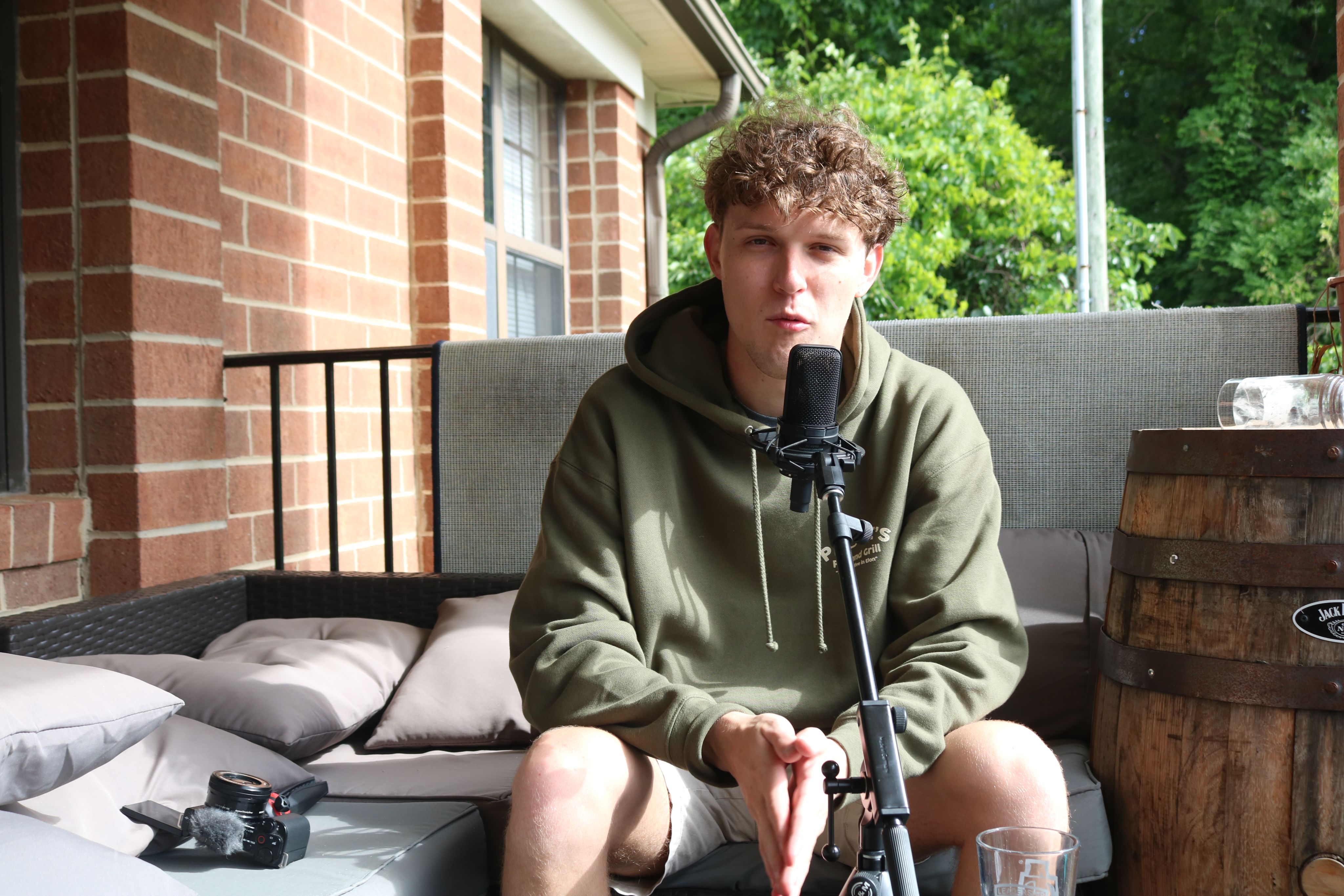 Elon University senior Mason Kaiser sits on the porch of his apartment with a microphone on Sunday, May 19, 2025.