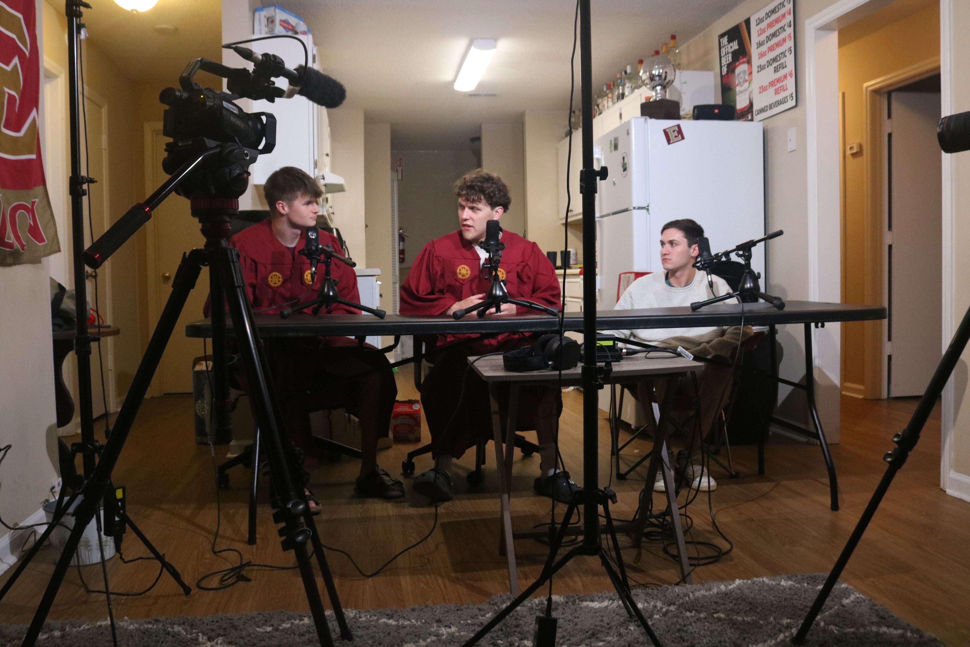 Elon University seniors Christian 'Drip' Van Vorhees, Mason Kaiser and junior Carter Puckett on the set of Reel Talk at Kaiser and Van Vorhees' Elon apartment on Tuesday, May 6, 2025.