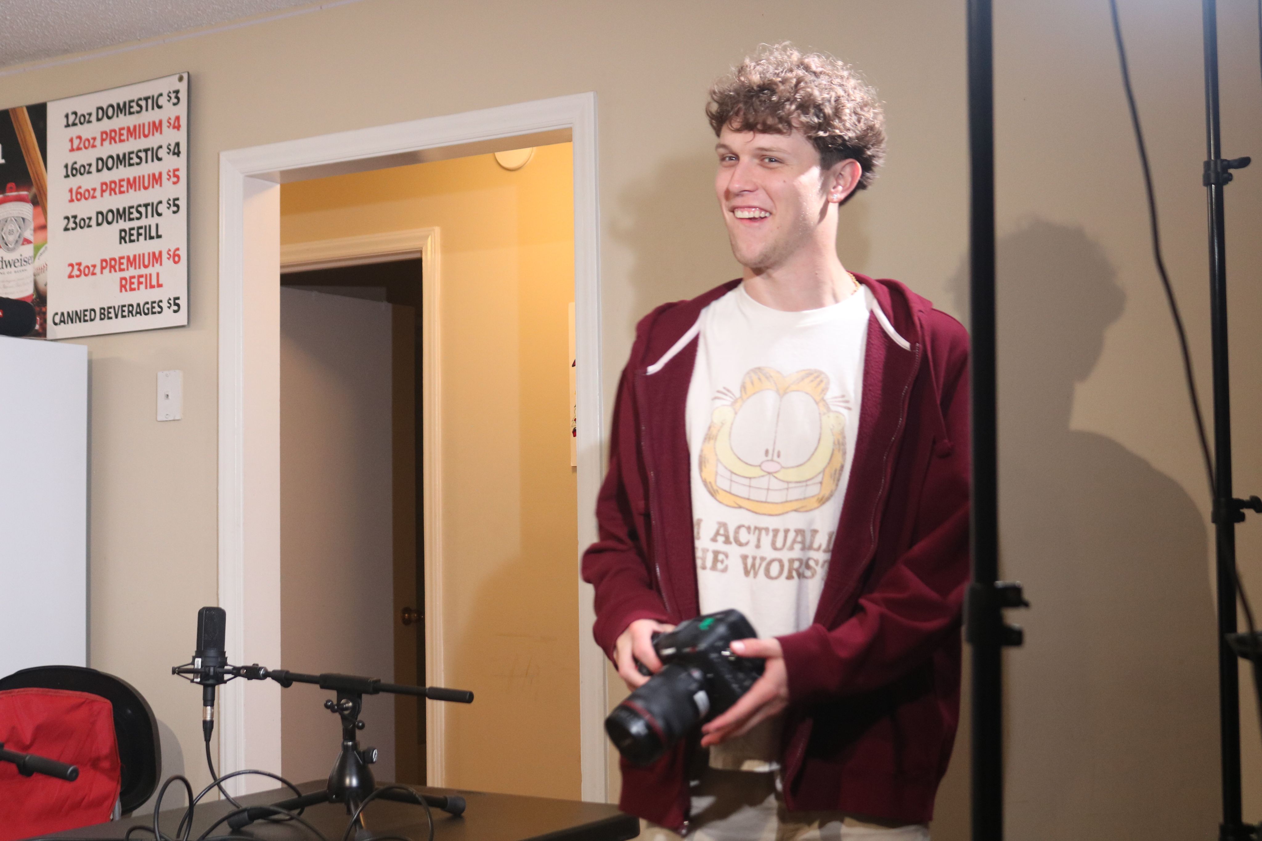 Elon University junior Carter Puckett sits at the table before the trio records Reel Talk on Tuesday, May 6, 2025. Puckett is a computer science major. According to Van Vorhees, he is in the beginning stages of making a website for the Reel Talk platform.