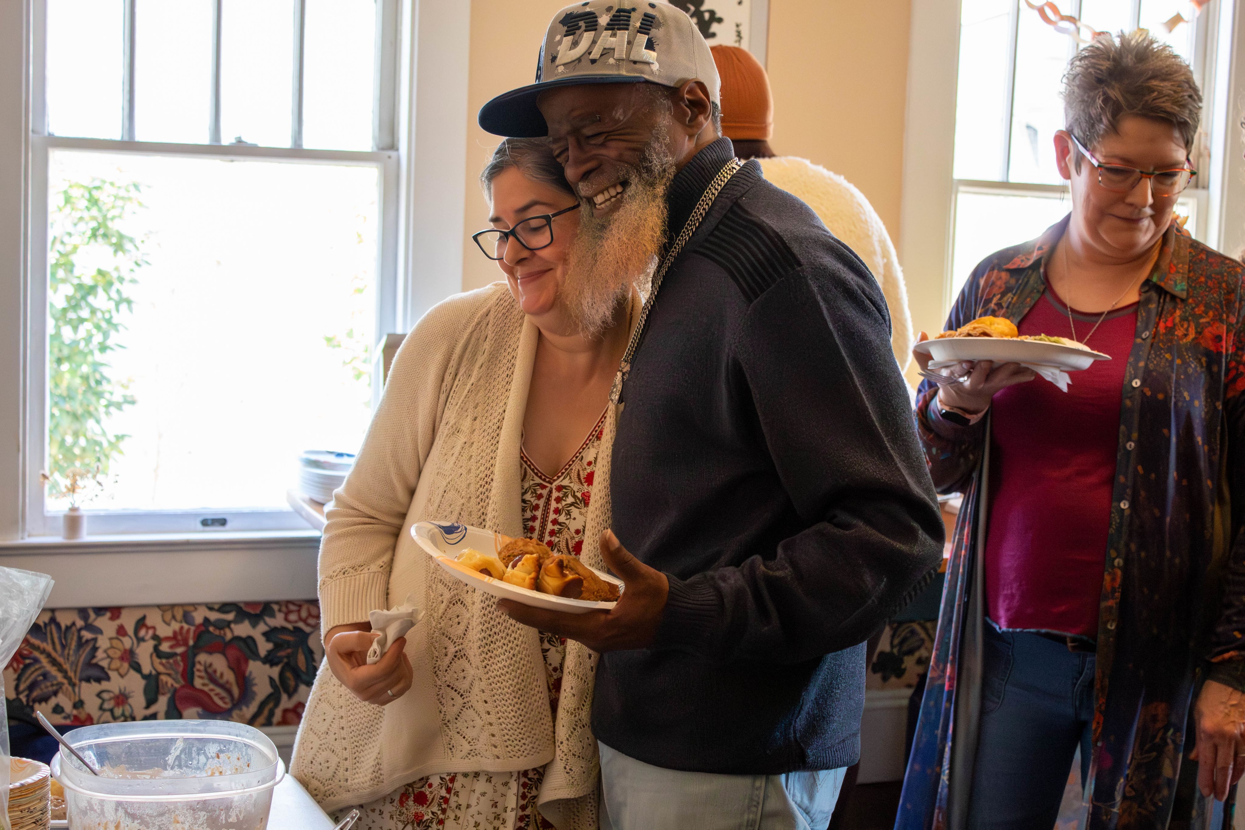 Thomas Clodefelter hugs Jennifer Nichols during the Triad Health Project's community gathering at Higher Ground. Photo by Nia Bedard.