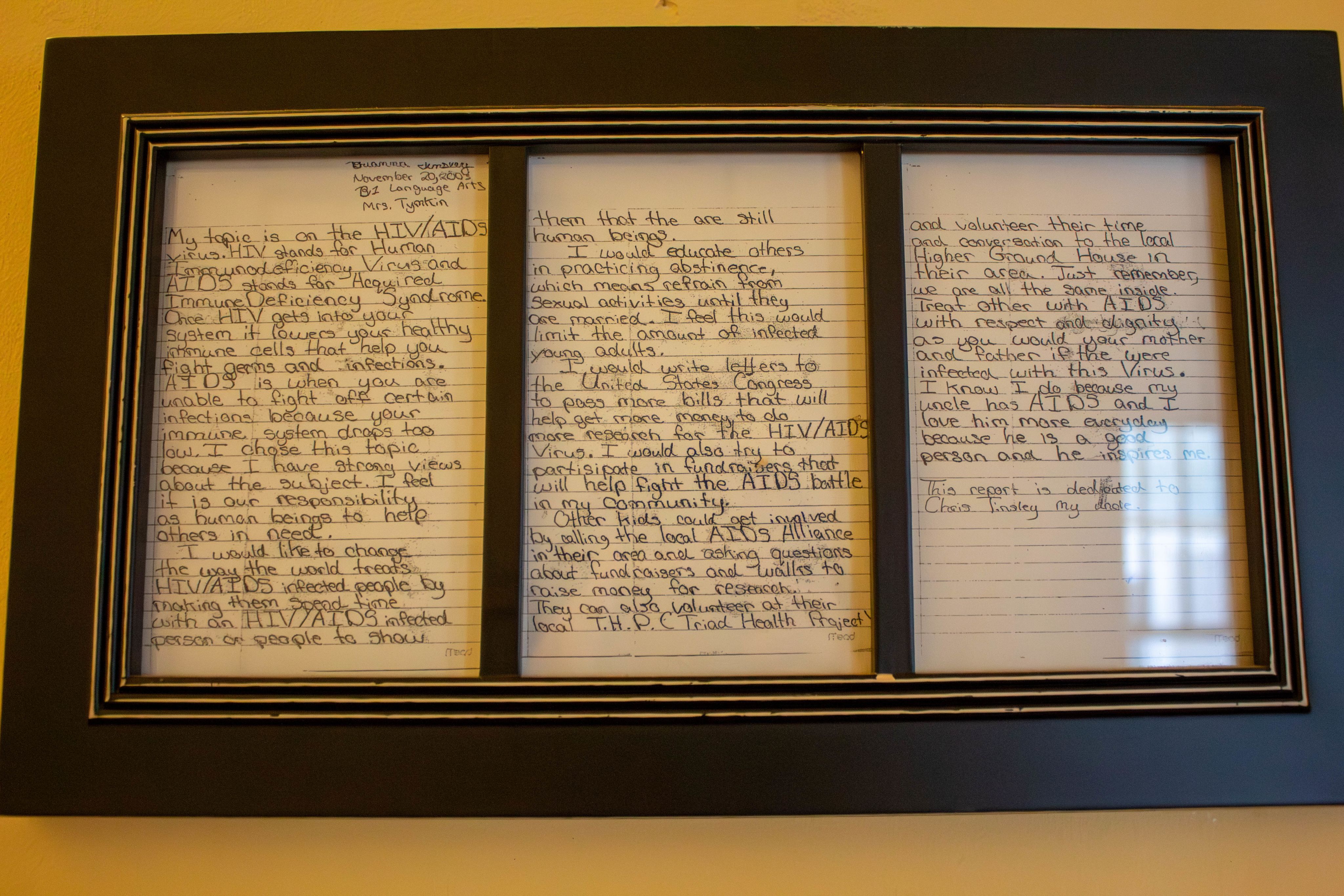 A essay written about the Triad Health Project and the author's uncle, who had HIV/AIDS, hangs in Higher Ground. Photo by Nia Bedard.